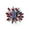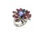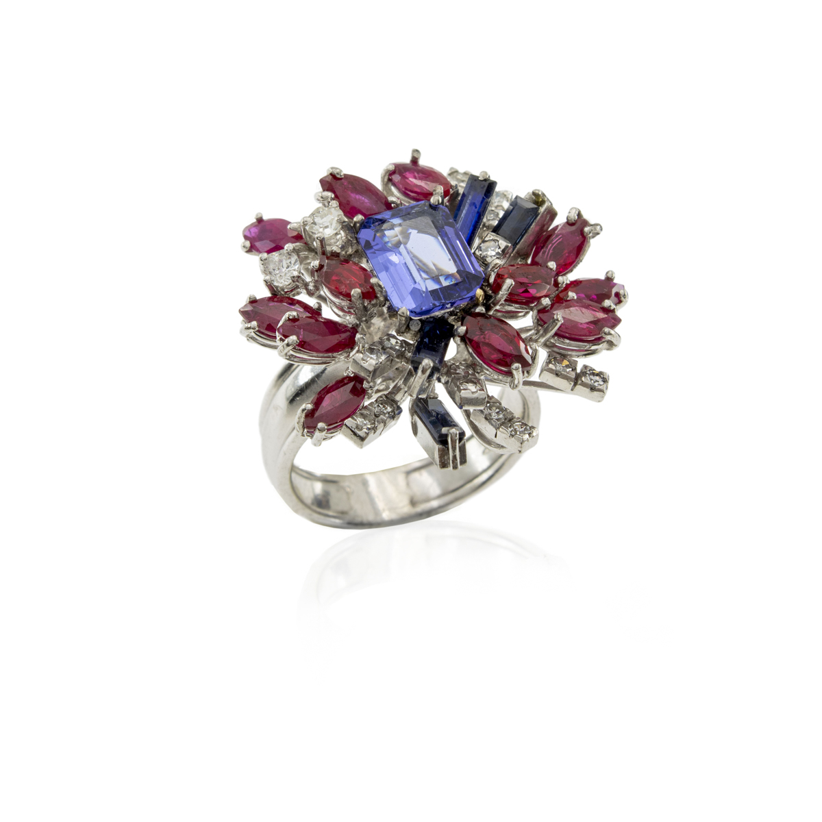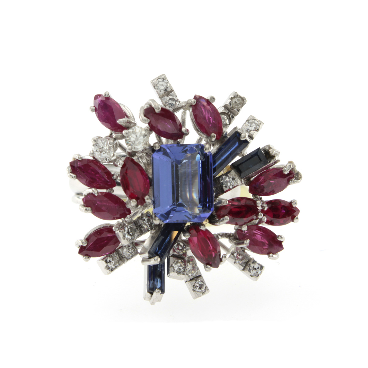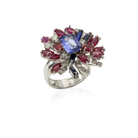 Anello in oro bianco 18kt tanzanite peso 17 gr. taglio ottagonale a gradini ct 2,40 circa, contornata da rubini taglio marquise, zaffiri taglio baguette e diamanti taglio brillante ct 0,25 circa, misura 17