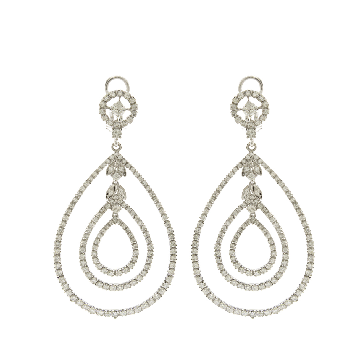 Orecchini pendenti in oro bianco 18kt e diamanti peso 12 gr. taglio brillante ct 3,72 circa, lunghezza 5,5 cm.