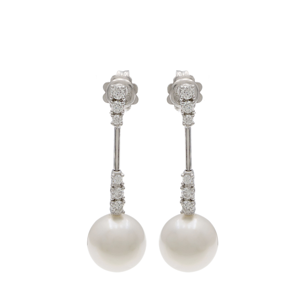 Orecchini pendenti in oro bianco 18kt peso 6 gr. perle australiane 11 mm. circa sormontate da diamanti taglio brillante ct 0,64 circa, lunghezza 3,5 cm.