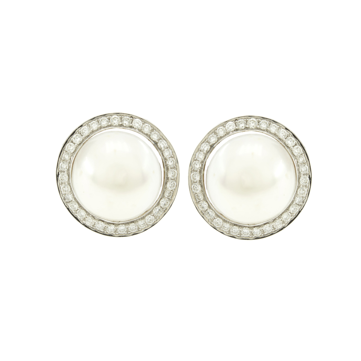 Orecchini a lobo in oro giallo e bianco 18kt peso 13 gr. due perle australiane 12 mm. circa contornate da diamanti taglio brillante 1 circa, diametro 1,7 cm.