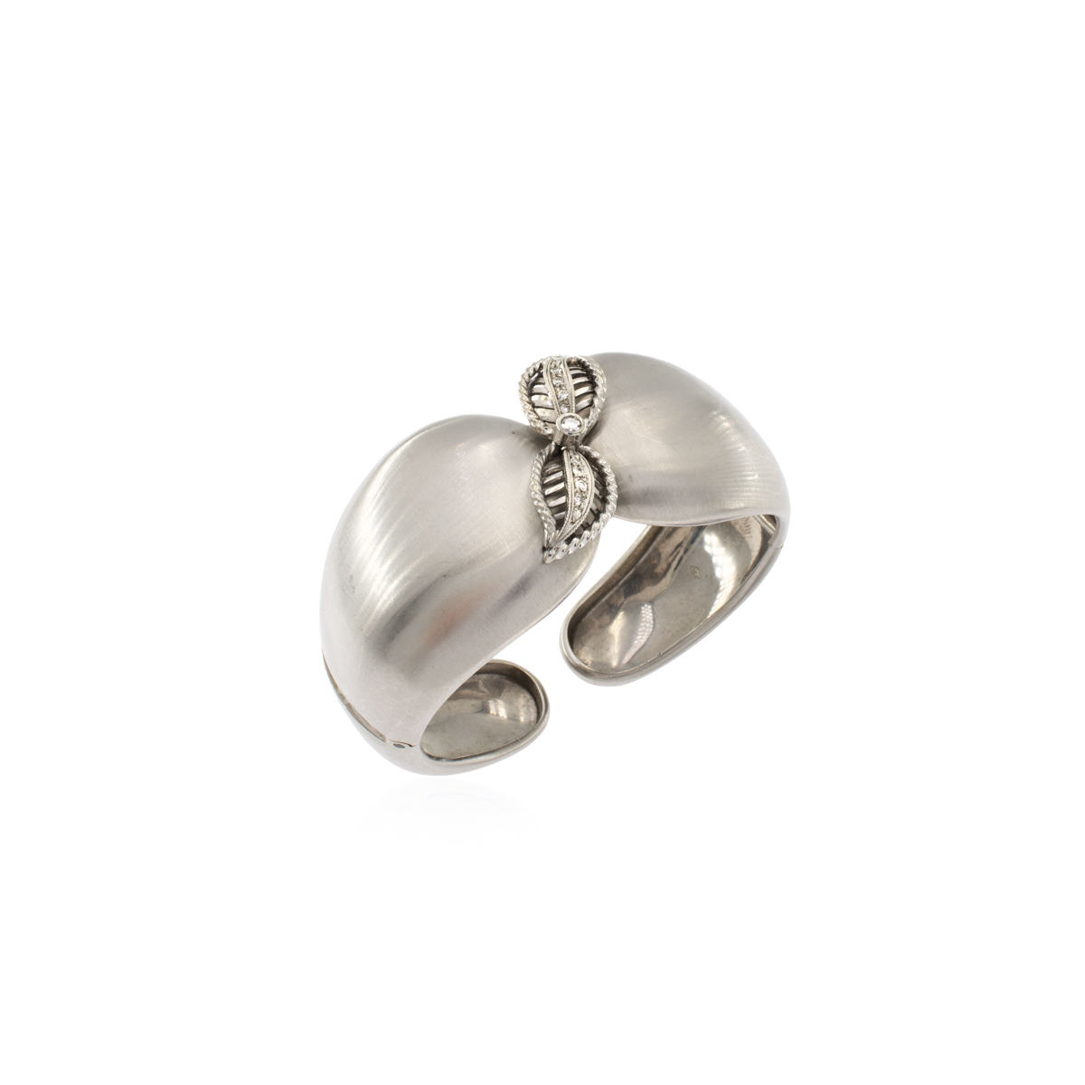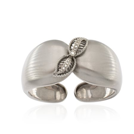 Bracciale a manetta in oro bianco satinato 18kt anni 60/70 peso 54 gr. centrato da foglie in oro bianco e diamanti taglio brillante, chiusura a molla, diametro 5,5 cm.