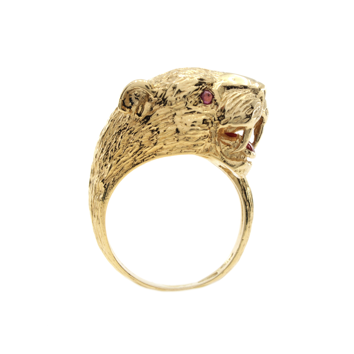 Anello pantera in oro giallo 14kt peso 9 gr. occhi di rubini e smalto rosso, misura 14