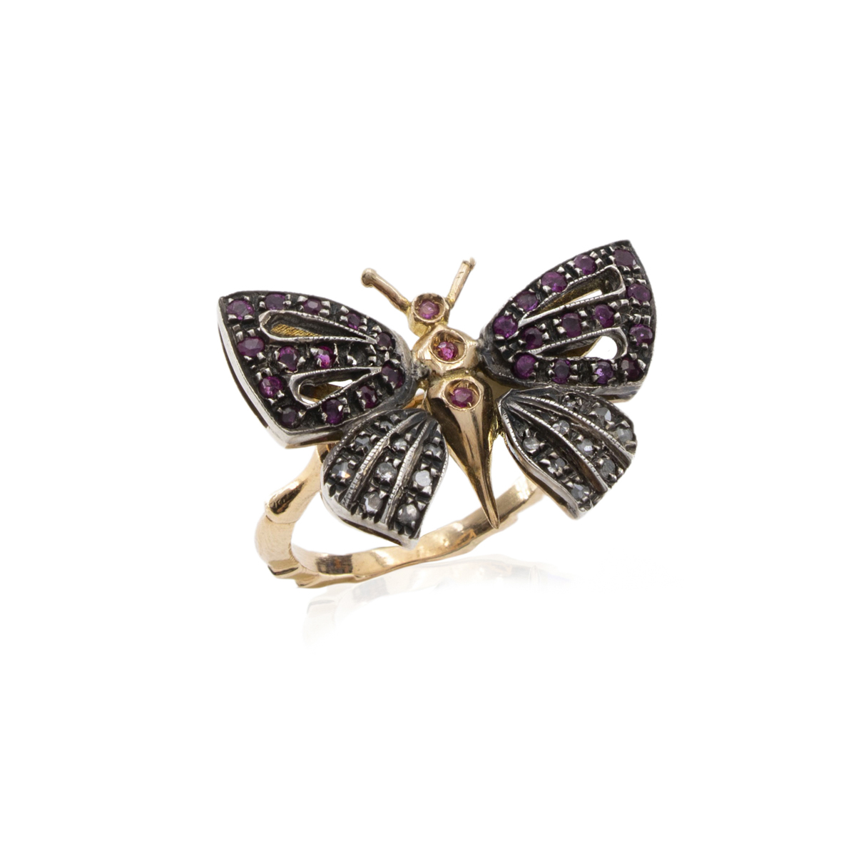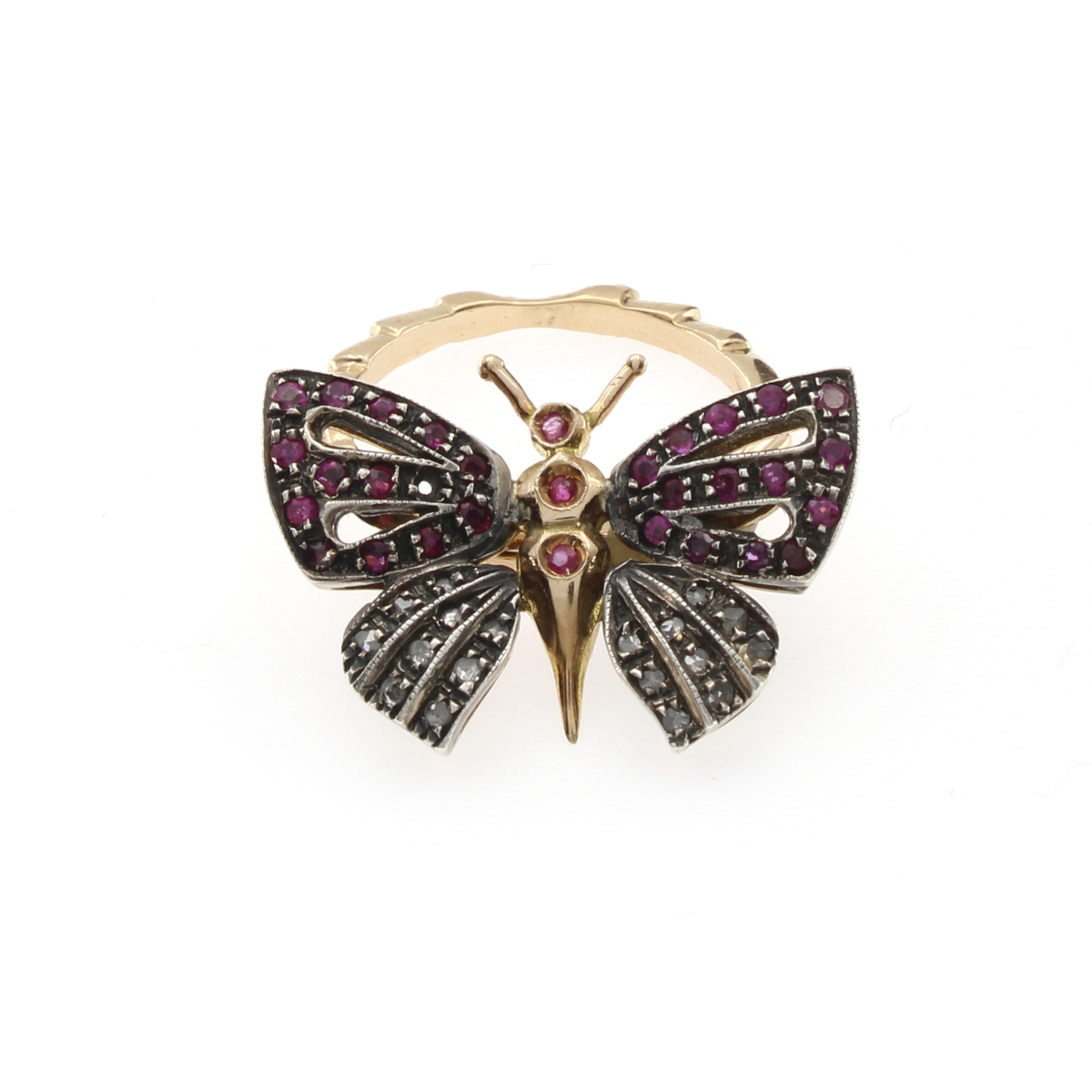Anello farfalla in oro giallo 14kt e argento peso 7 gr. rubini tondi e rose di diamante, misura 16