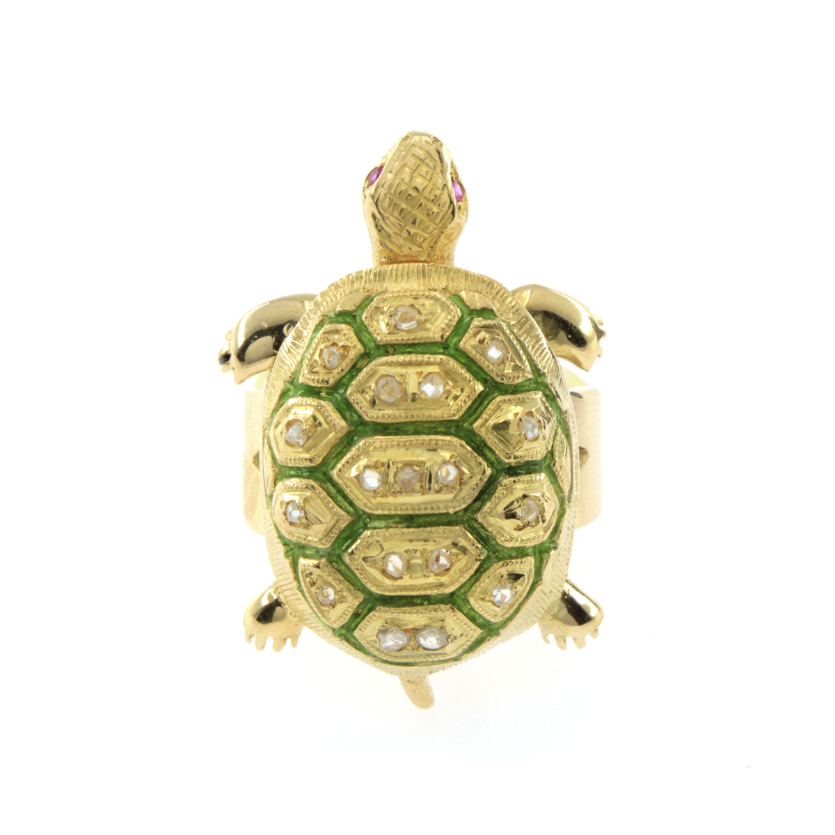 Anello tartaruga in oro giallo 18kt peso 13 gr. smalto verde e rose di diamante, occhi di rubini, misura 11,5