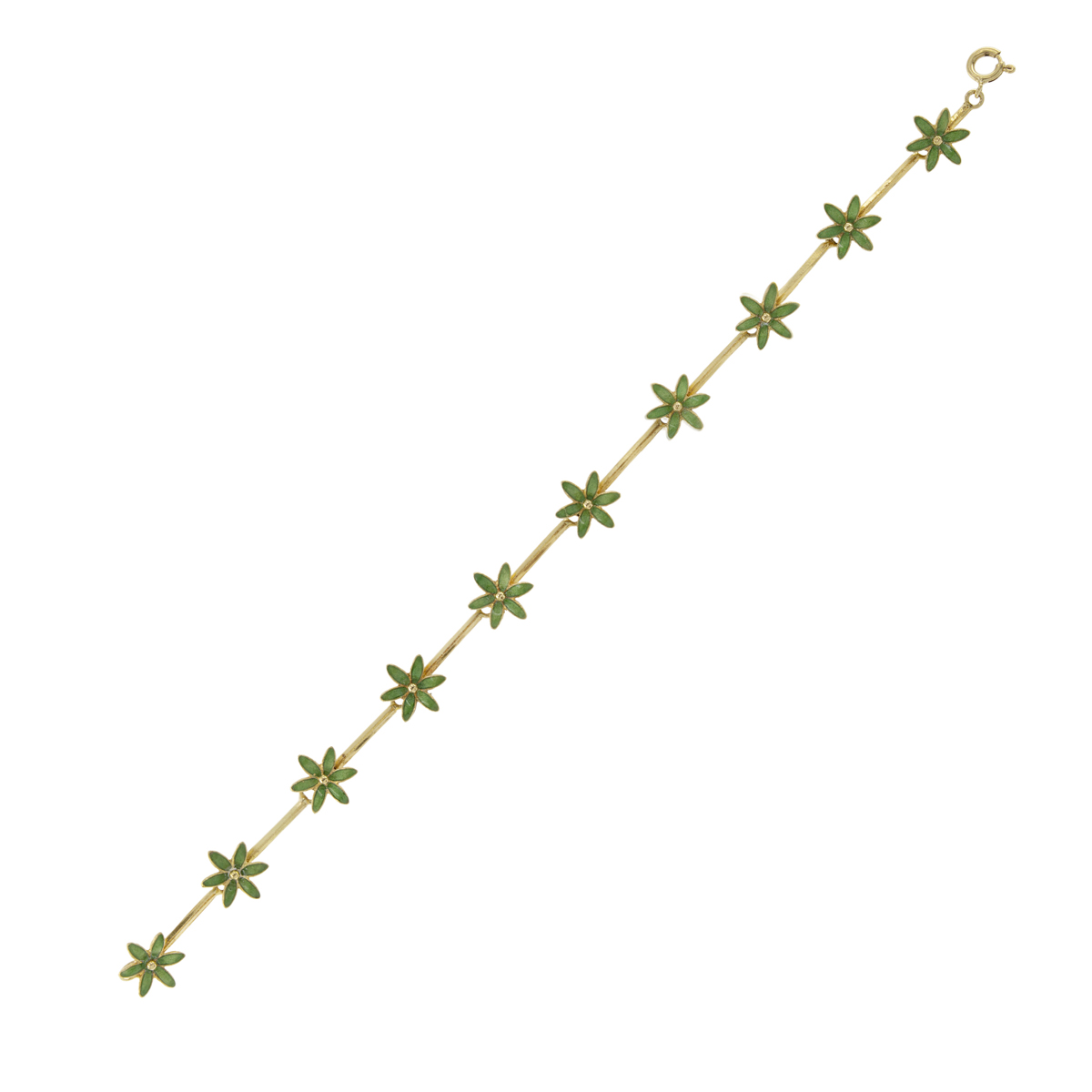 Bracciale fiori in oro giallo 18kt peso 11 gr. fiori decorati con smalto verde, lunghezza 18 cm.