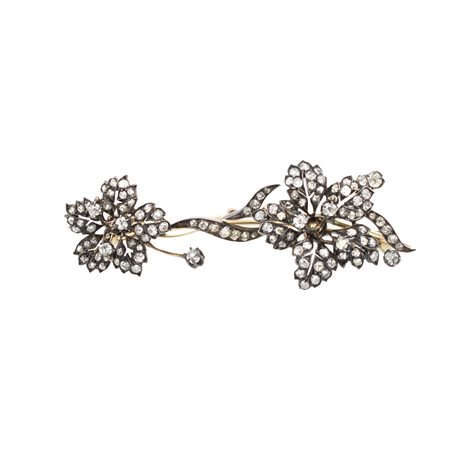 Antica spilla ramage in oro argento e rose coroné primi 900 peso 19 gr. ct 2,50 circa, lunghezza 7,5 cm.