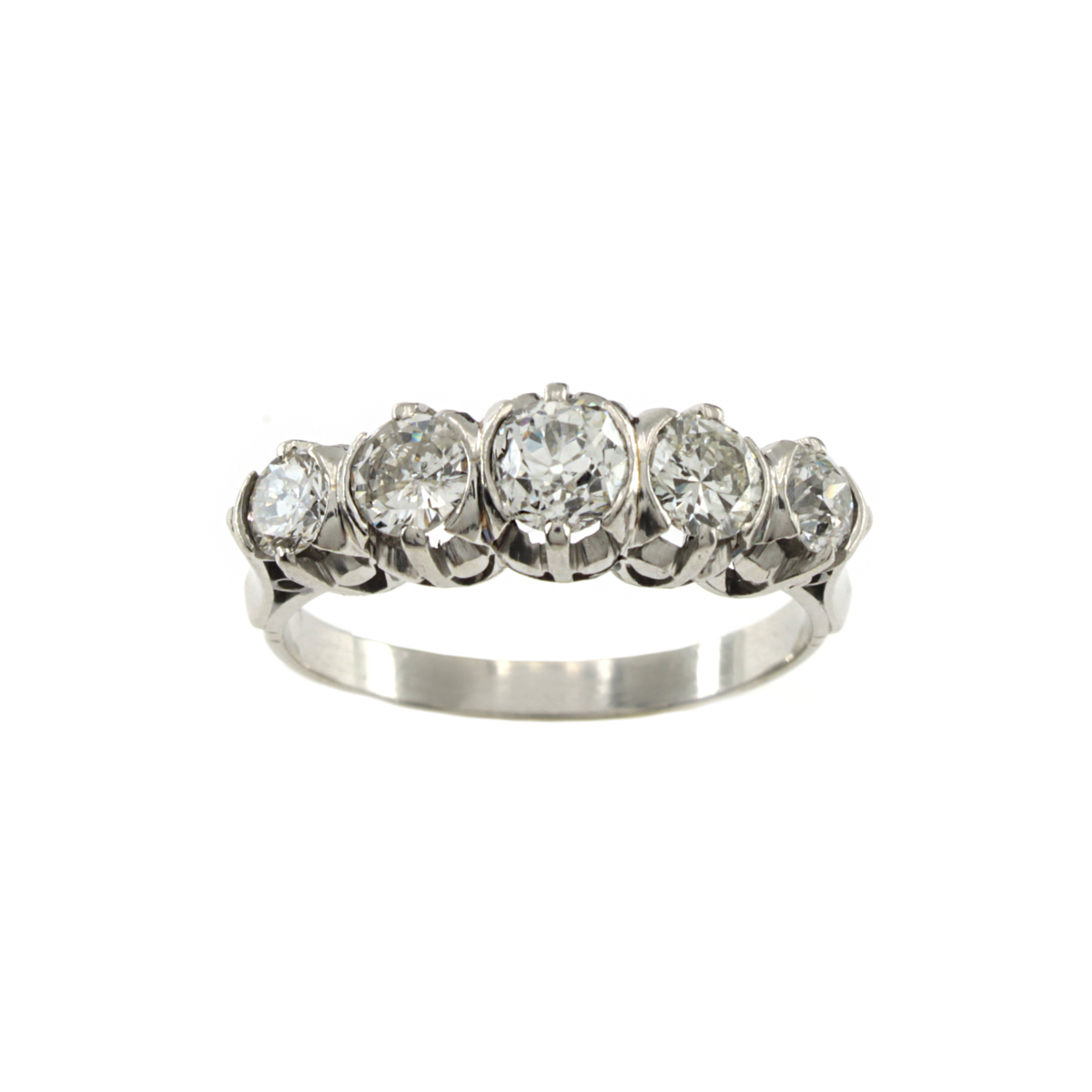 Anello riviere in platino cinque diamanti anni 40/50 peso 4 gr. taglio brillante antico e moderno ct 1 circa, misura 12