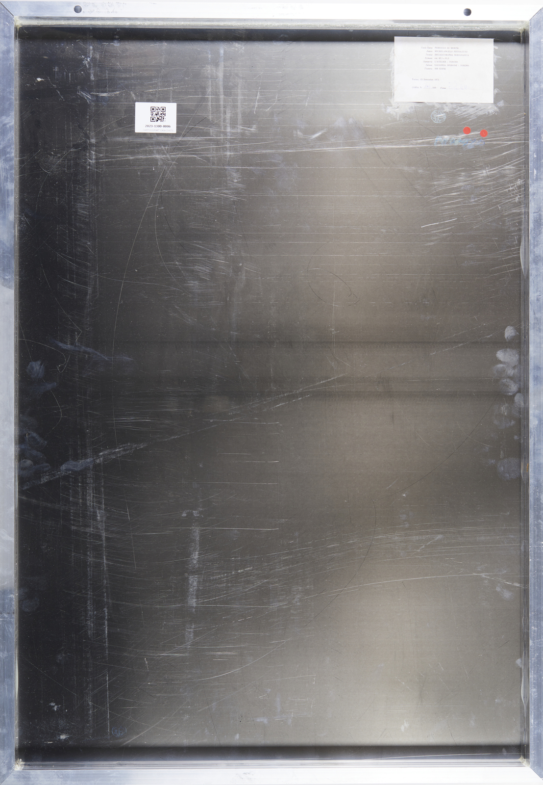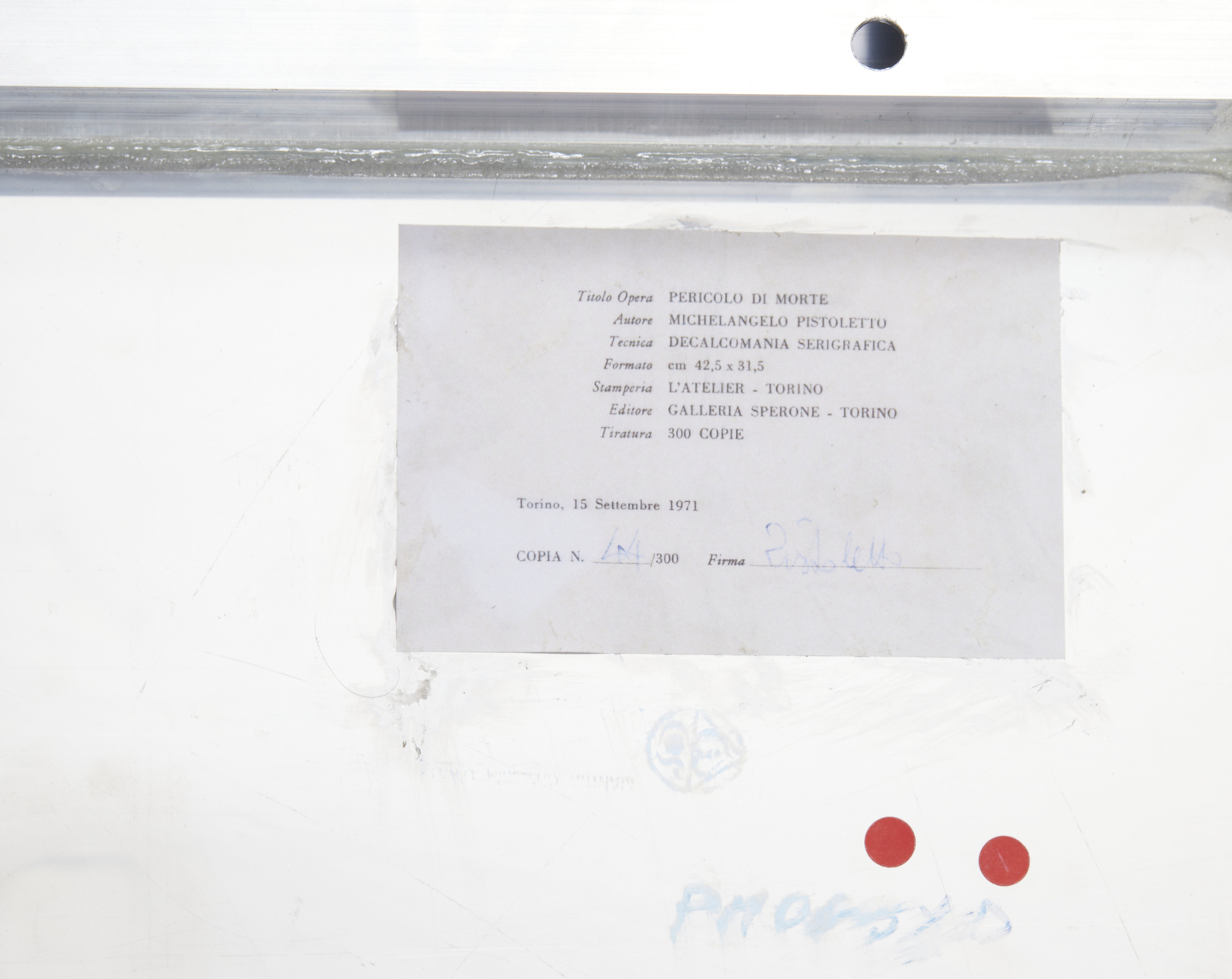 PISTOLETTO MICHELANGELO (n. 1933) Pericolo di morte. 1971. Decalcomania serigrafica su lastra di acciaio specchiante.. Cm 70,00 x 100,00. Es. 44/300. Al retro etichetta della Galleria Sperone,Torino, con firma e tiratura. Autentica dalla Galleria Sperone, Torino, datata 15 settembre 1971, riportante la firma dell'artista e la tiratura. Stampatore: L'Atelier, Torino. Editore: Galleria Sperone, Torino. Provenienza: Galleria Sperone, Torino; Collezione privata, Torino. Lievi difetti. Cornice presente
