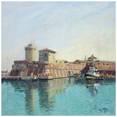 GIANCARLO LANDI Livorno ? Mattinata a Barriera Olio su masonite 56,5 x 56,5. Firma in b. a d.; sul verso titolo e firma.