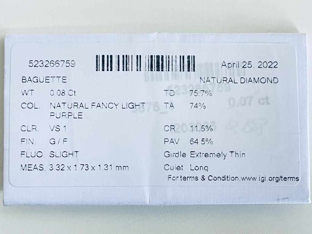 DIAMANTE NATURAL POLISHED 0,08 CARATI COLORE FANCY VIOLA CHIARO - PUREZZA VS1 - TAGLIO BAGUETTE – CERTIFICATO IGI – F20303-6