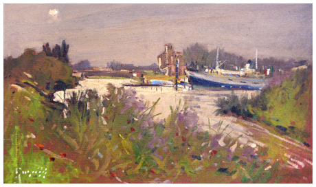 ALDO MAZZI Livorno 1937 Senza titolo Olio su faesite 30 x 50. Firma in b. a s.; sul verso firma + timbro studio dell’artista.