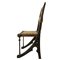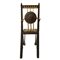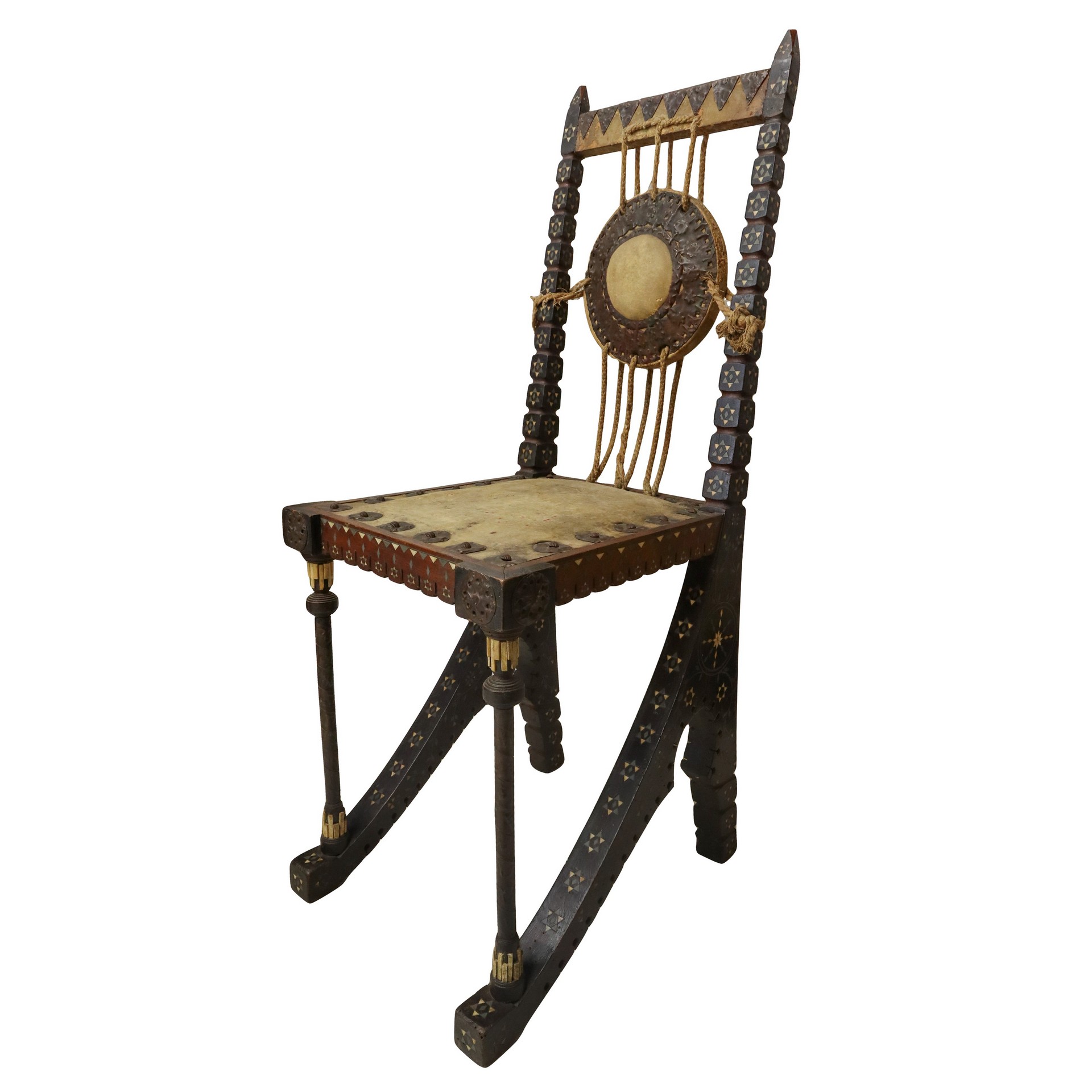 Carlo Bugatti - Rarissima coppia di sedie, in legno di noce tinto ebano, lavorato e tornito, decorazioni in rame sbalzato, intarsi in osso, seduta in cuoio.