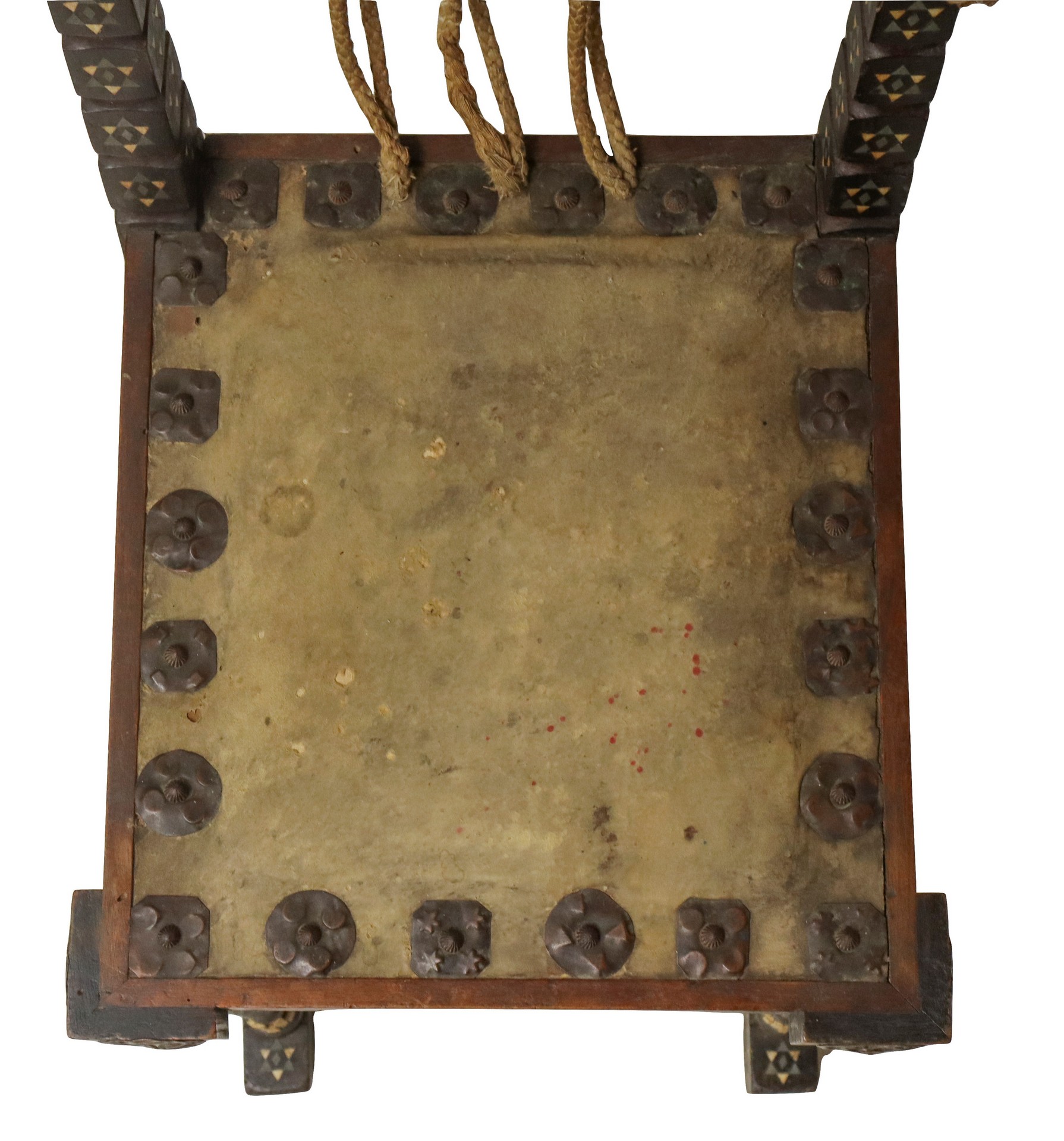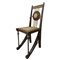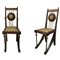 Carlo Bugatti - Rarissima coppia di sedie, in legno di noce tinto ebano, lavorato e tornito, decorazioni in rame sbalzato, intarsi in osso, seduta in cuoio. Mai restaurate. Segni del tempo sulla seduta in cuoio.