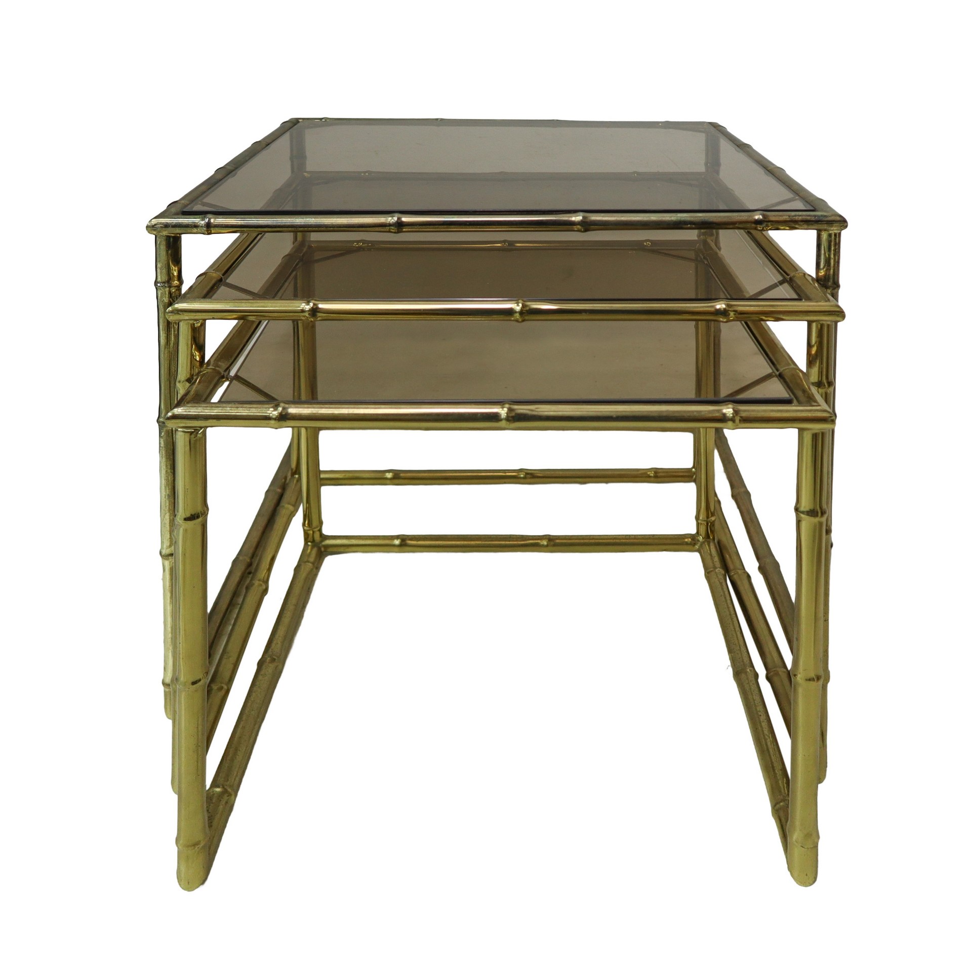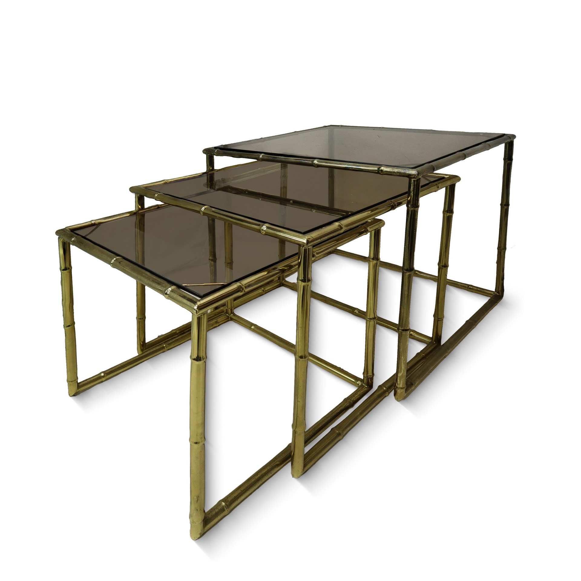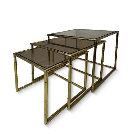 Trittico di tavolini da caffè in ottone dorato Grande H cm 76x39x61, medio H cm 40x40x40, piccola cm 35,5x35x35 Minimi segni d'uso