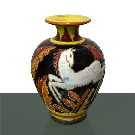 Vaso in ceramica policromo con cavallo bianco e vegetali nei toni del giallo e arancione H cm 17x11,5 Alla base A-487