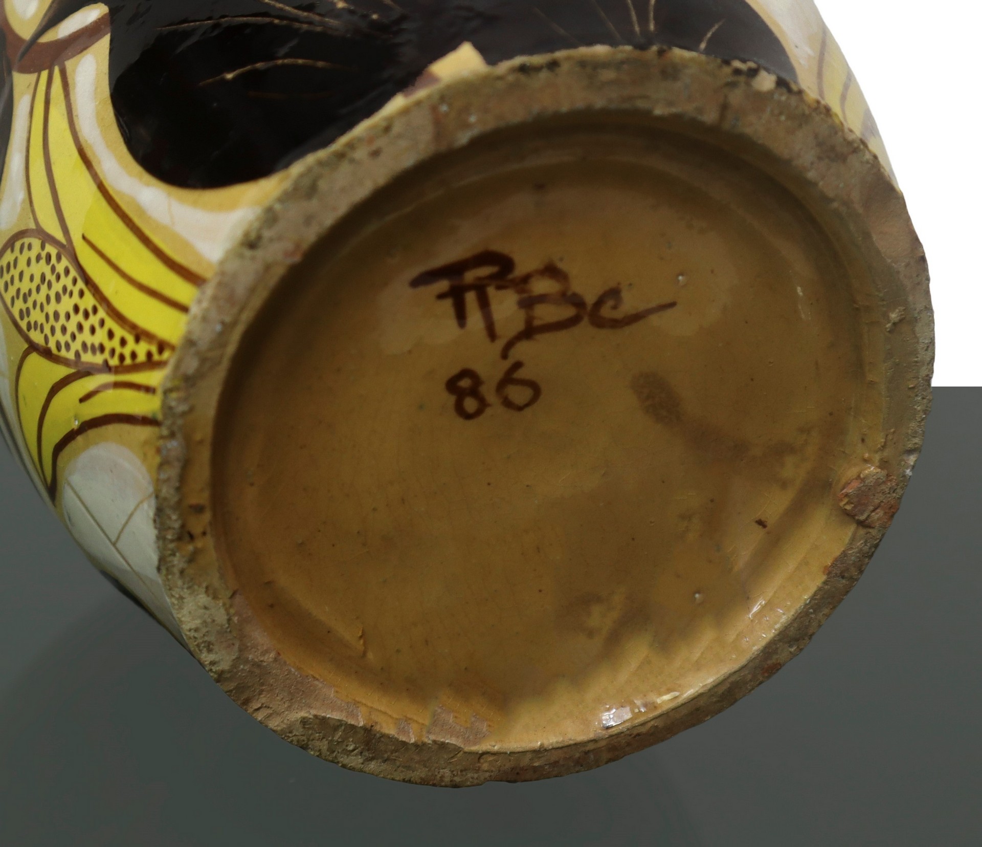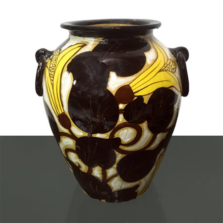 R. Bini & Fratelli Carmignani (Pisa 1905) - Vaso in terracotta invetriata Liberty Art Deco' con decori di fiori e foglie gialli e marroni, 1986 H cm 25x19 Con finte maniglie. Marchio e data alla base. Leggermente scalfito in alcuni punti.Con finte maniglie. Marchio e data alla base. Leggermente scalfito in alcuni punti.