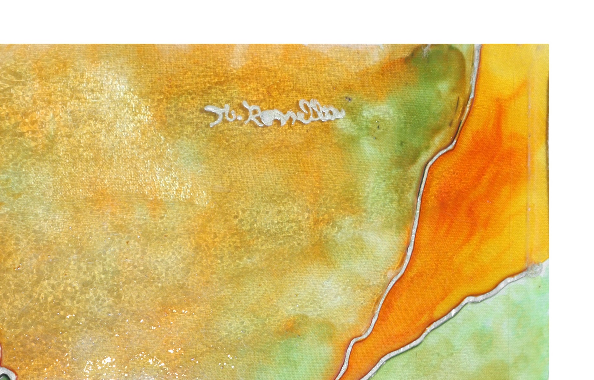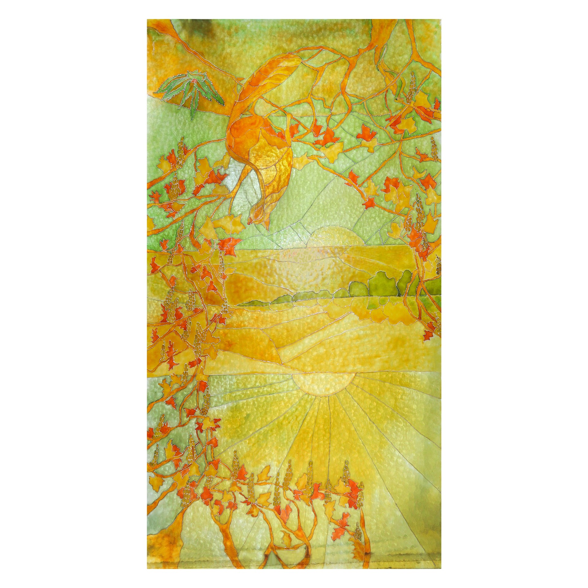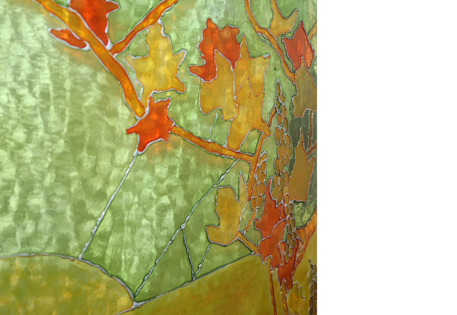 Grande vetrata dipinta e colorata h cm 168 x 90 vetro colorato a piombo Paesaggio con vite e volpe