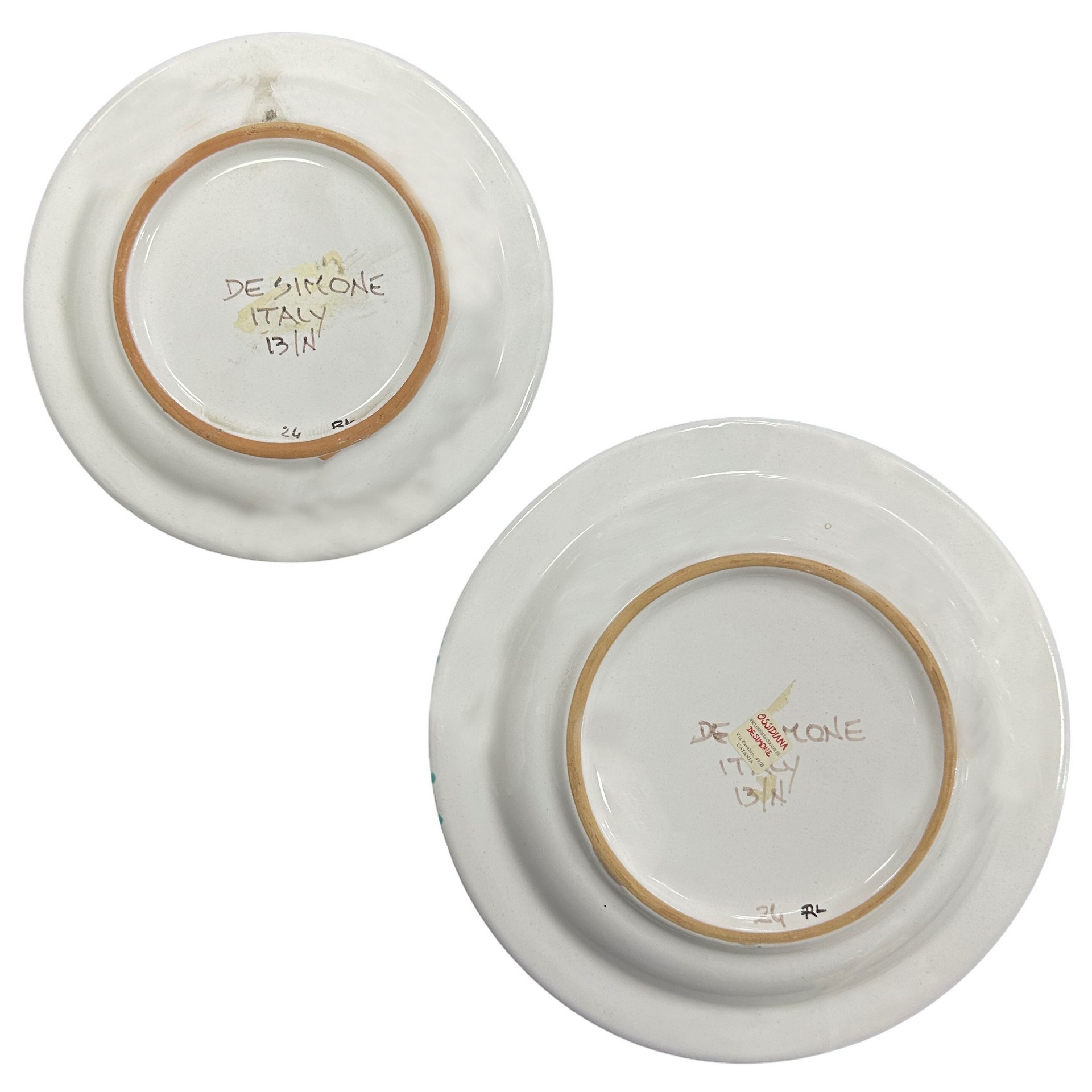 De Simone - Coppia di piatti da muro in ceramica dipinto a mano con personaggio seduto alla macchina da cucire, 1960/1970 H cm 2,5 - diametro cm 20,5 - piatto gr. d. cm 26 Spugnato verde acqua al bordo. Firmato De Simone Itali 13/N alla base.Spugnato verde acqua al bordo. Firmato De Simone Itali 13/N alla base.