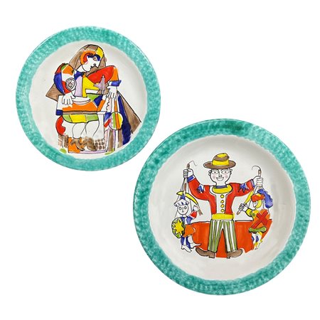 De Simone - Coppia di piatti da muro in ceramica dipinto a mano con personaggio seduto alla macchina da cucire, 1960/1970