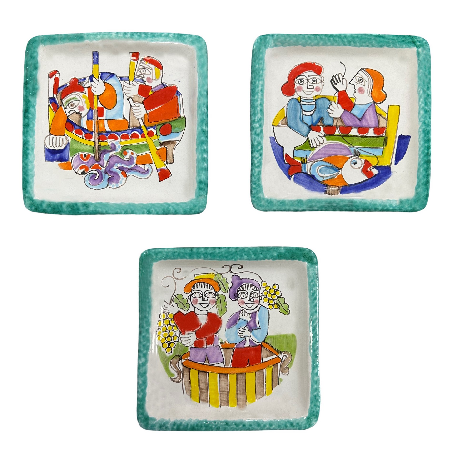De Simone - Tre piatti quadrati da muro in ceramica dipinti a mano raffigurante pescatori e viticoltori, 1960/1970