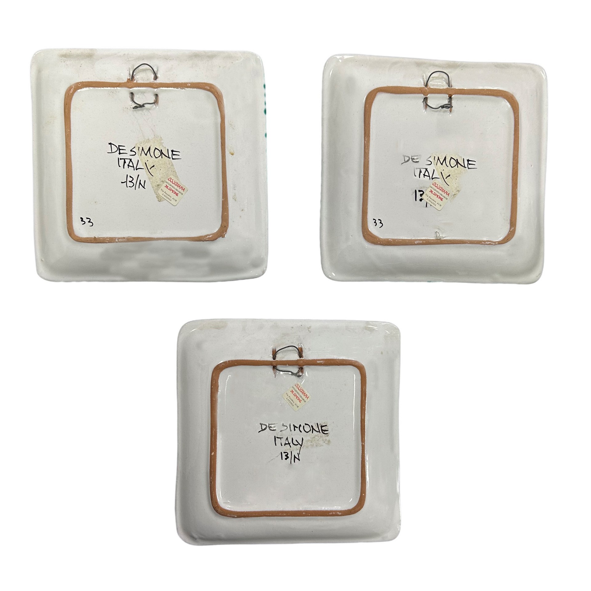 De Simone - Tre piatti quadrati da muro in ceramica dipinti a mano raffigurante pescatori e viticoltori, 1960/1970 H cm 20x20 Spugnato verde acqua al bordo. Firmato alla base De Simone Italy 13/N.Spugnato verde acqua al bordo. Firmato alla base De Simone Italy 13/N.