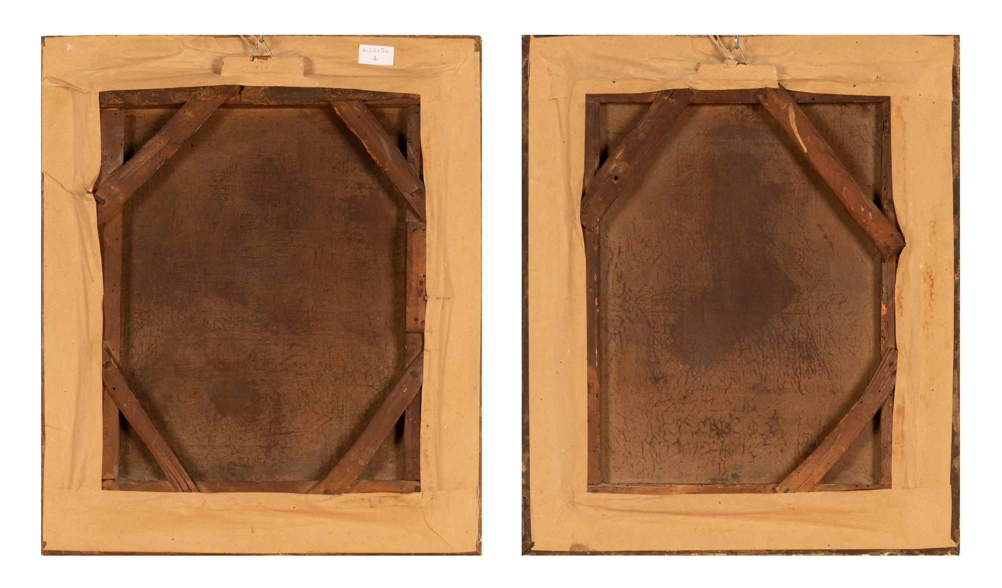 Cornici dorate e intagliate con agli angoli motivi floreali a rilievo.