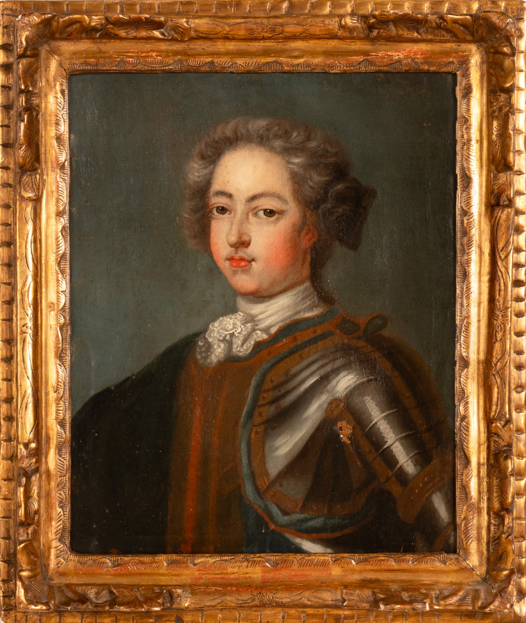 Luigi XV è medesimamente immortalato di tre quarti con il volto rivolto verso destra. Indossa un vestito sopra un'armatura. Il volto sereno lascia intravedere un accenno di baffi del sovrano che si sposò appena tredicenne.