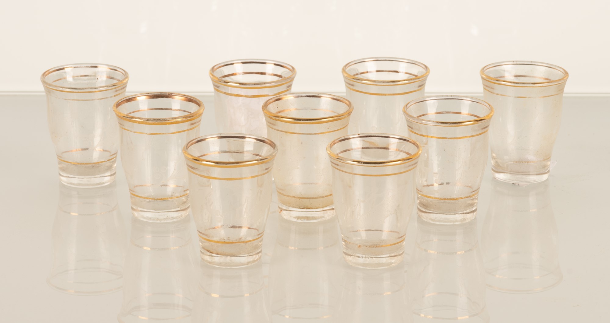 Set di 9 bicchierini da rosolio in vetro lumeggiato in oro ai bordi