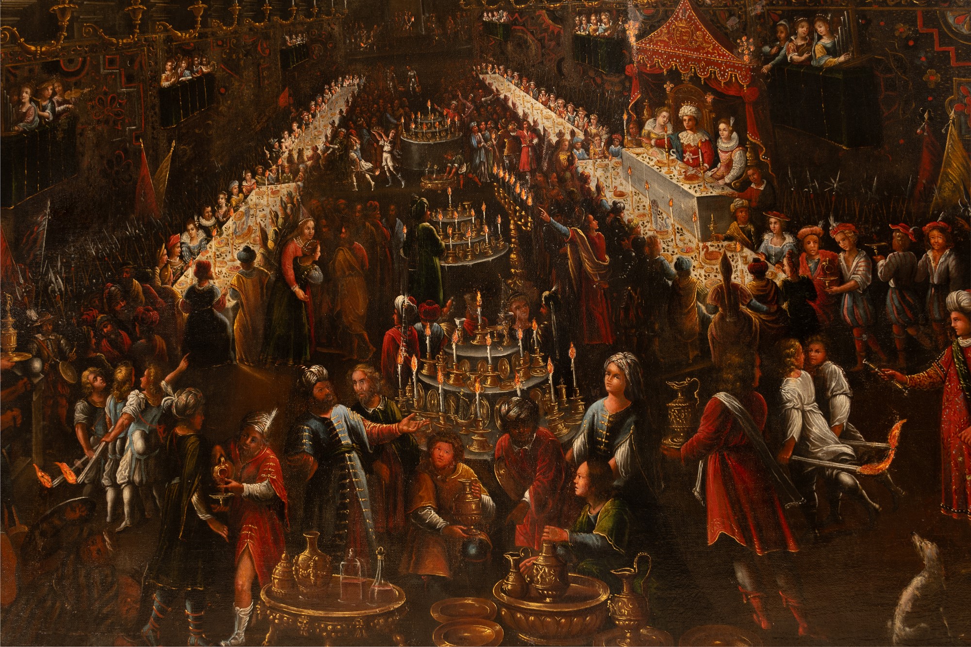 Una fonte di luce dall’alto rischiara l’ambientazione notturna e rende vividi personaggi, suppellettili e stoffe. Il dettagliativisimo non viene sacrificato a benificio del riempimento: la raffigurazione prospettica del fasto della corte babilonese è dipinta invero con grande minuzia di particolari. La fiamma delle torce è resa ancor più vera da veloci tocchi materici che restituiscono impressioni tattili alla tela - di dimensioni paragonabili alla tradizione del telero veneto.