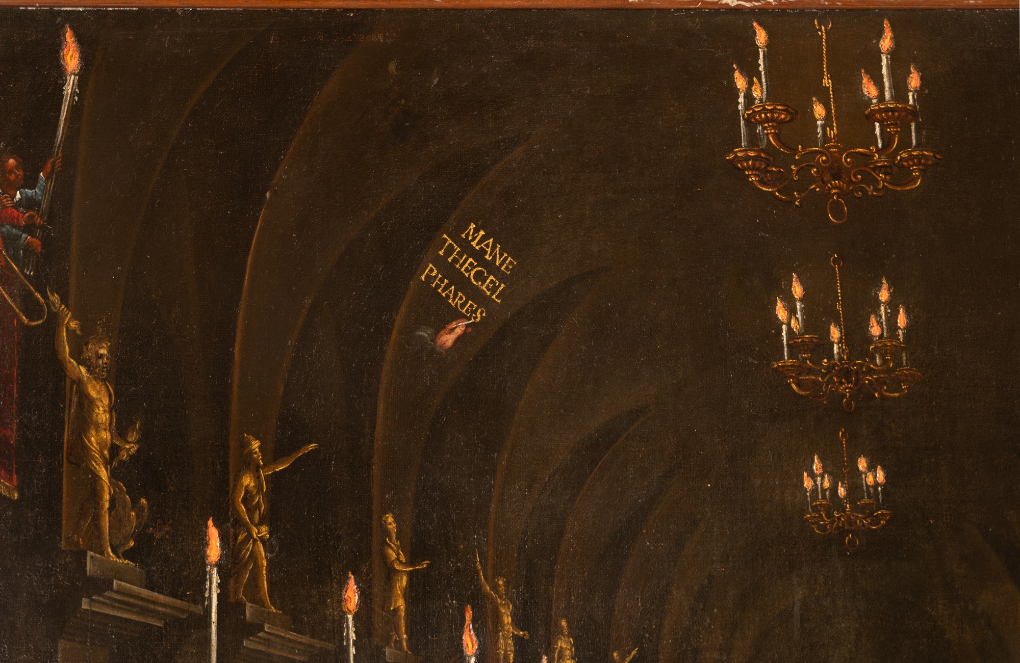 olio su tela cm 144x189 Il dipinto, ambientato con grande probabilità dentro un palazzo di Venezia, città nella quale il cosidetto pittore de' più pennelli giunse intorno ai venticinque anni ( tra il 1625 ed il 1678 circa) , vuol rappresentare il fastoso banchetto organizzato dal re babilonese Baldassarre, figlio di Nabucodonosor, durante il quale mentre i i suoi dignitari bevevano dai grandi vasi d’oro e dalle suppellettili rubati dal padre al Tempio di Gerusalemme, comparve una mano misteriosa che scrisse accanto ad un candelabro della parete del soffitto tre parole incomprensibili: "Mane, Thecel, Phares".