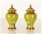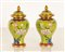 Coppia di piccoli vasi con coperchio in smalto cloisonnè verde. Finiture in ottone.