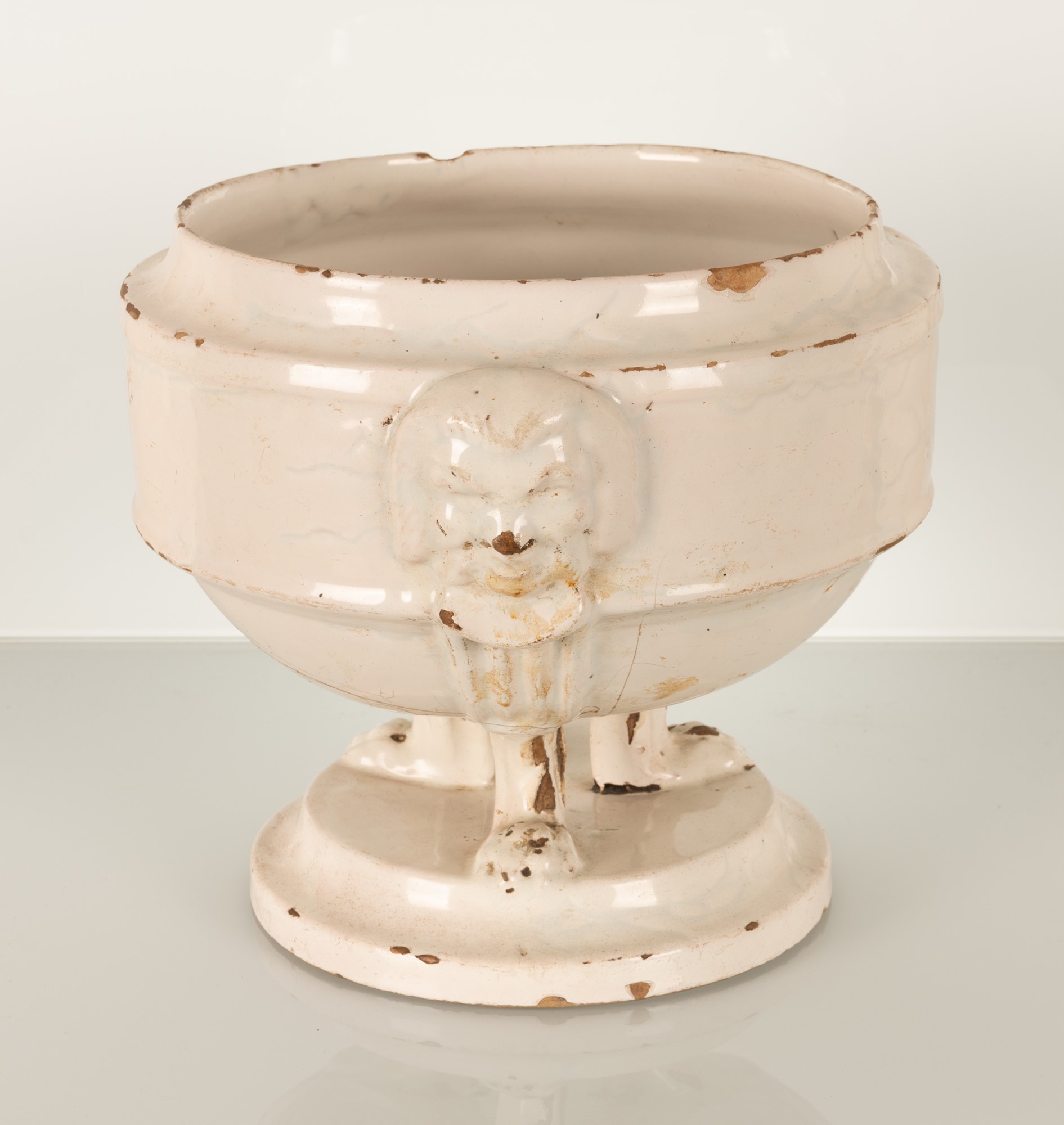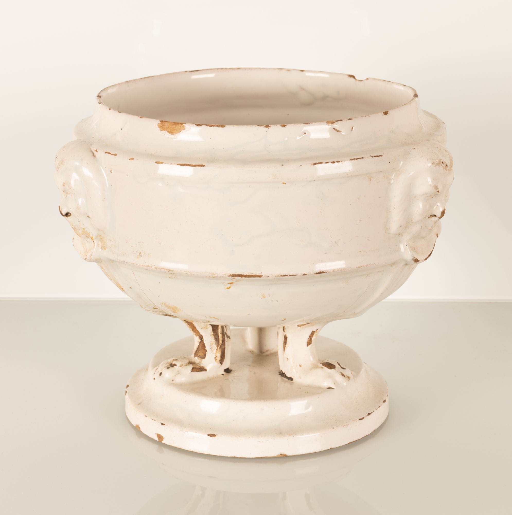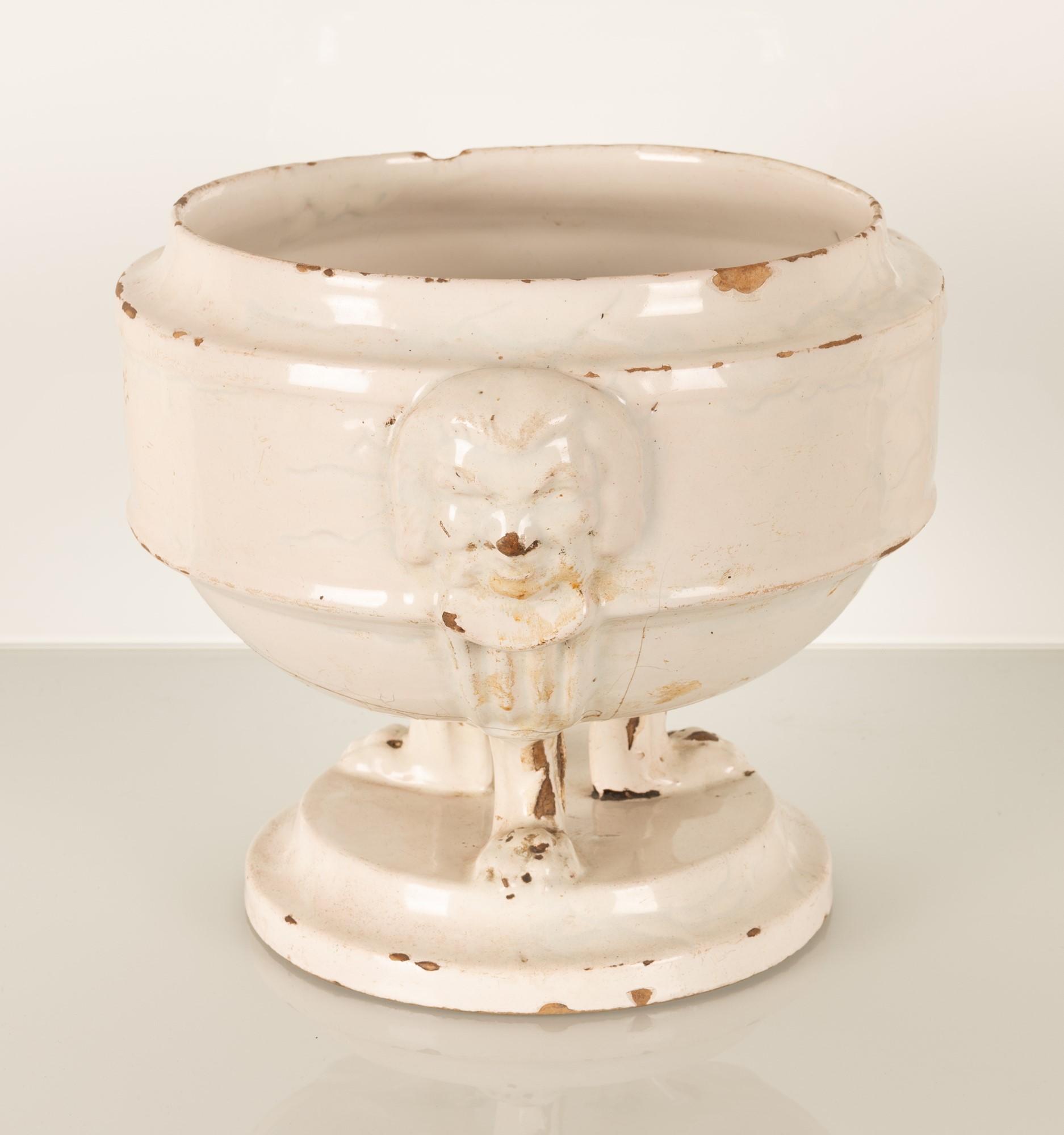 Zuppiera di epoca napoleonica con mascheroni leonini, piedi ferini su base a disco. Manifattura Castelli, inizi del XIX secolo