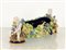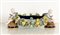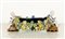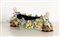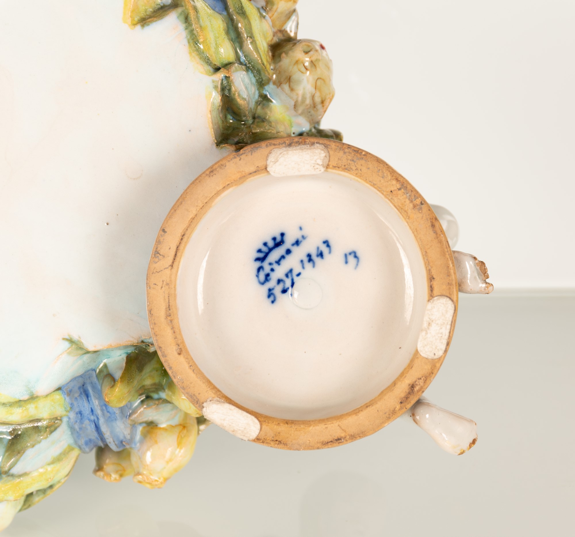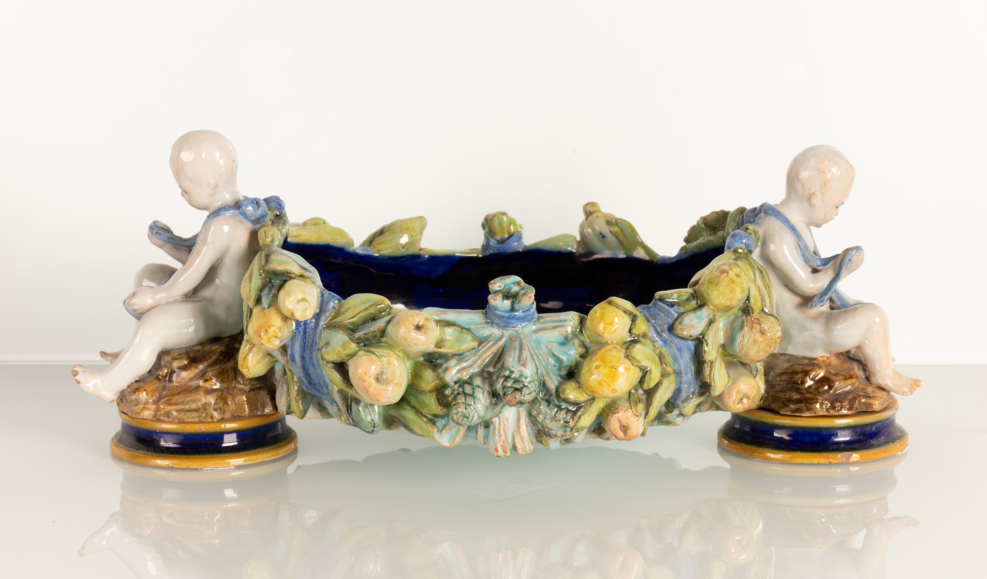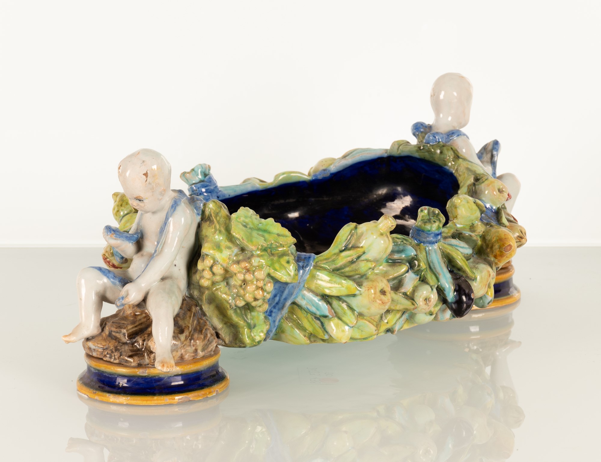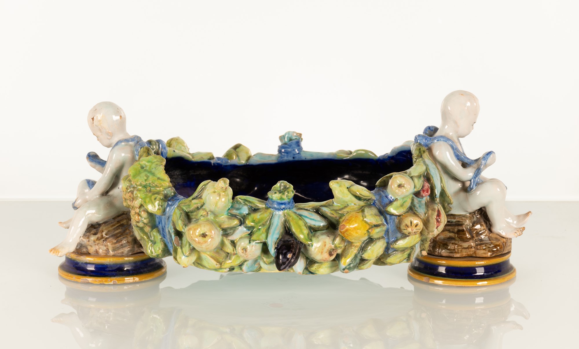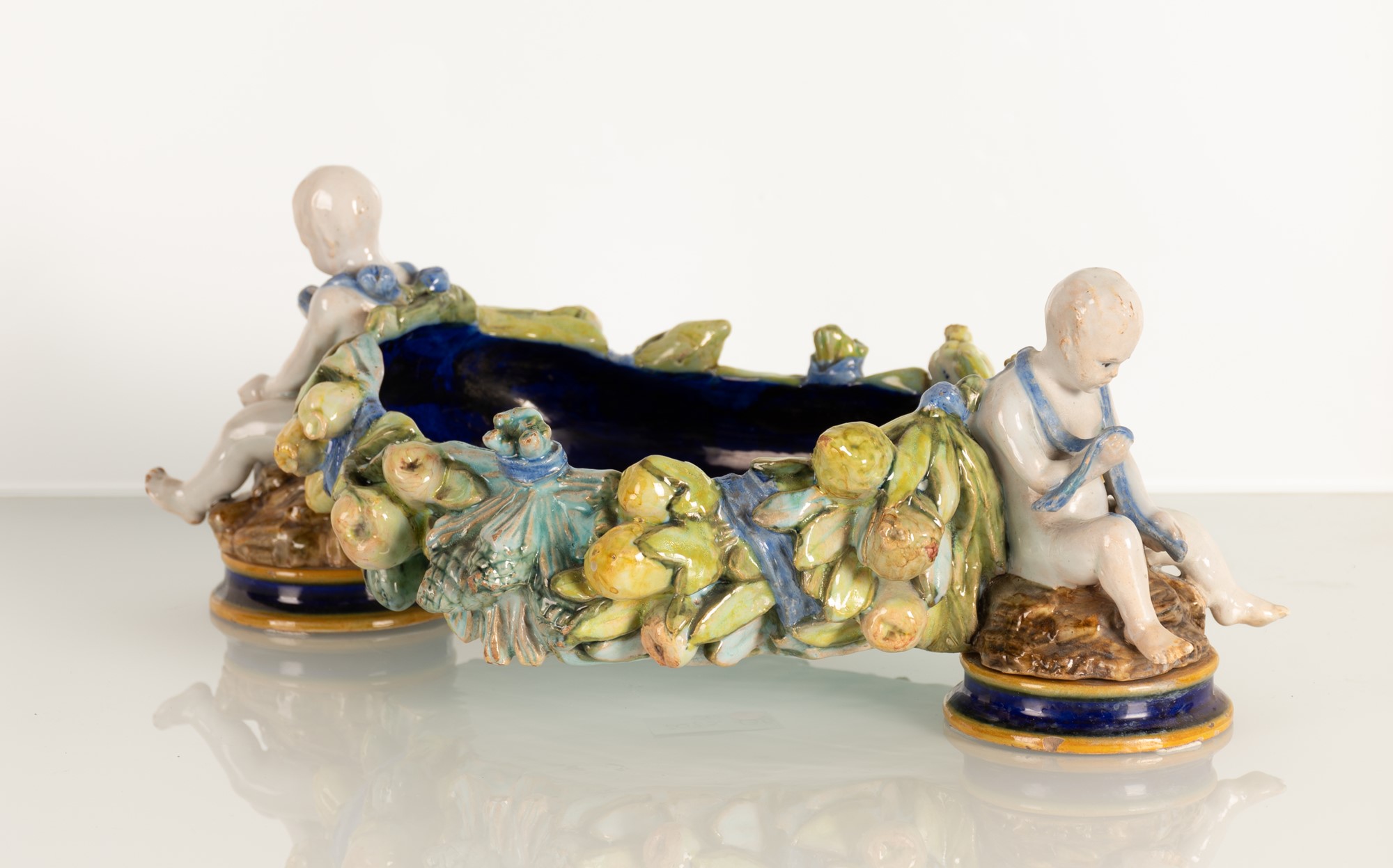 Centrotavola di gusto robbiano neoquattrocentesco con ai lati due putti in maiolica bianca modellati a tutt tondo che trattengono una ghirlanda di frutta e fiori formante le pareti dell'oggetto dipinto all'interno in blu di Prussia