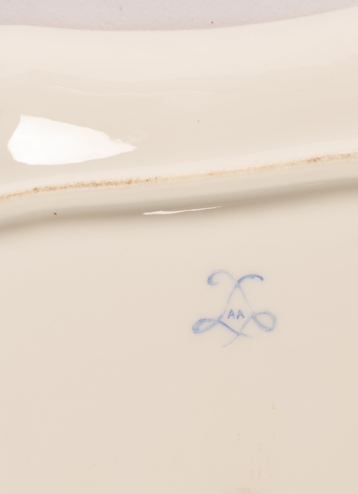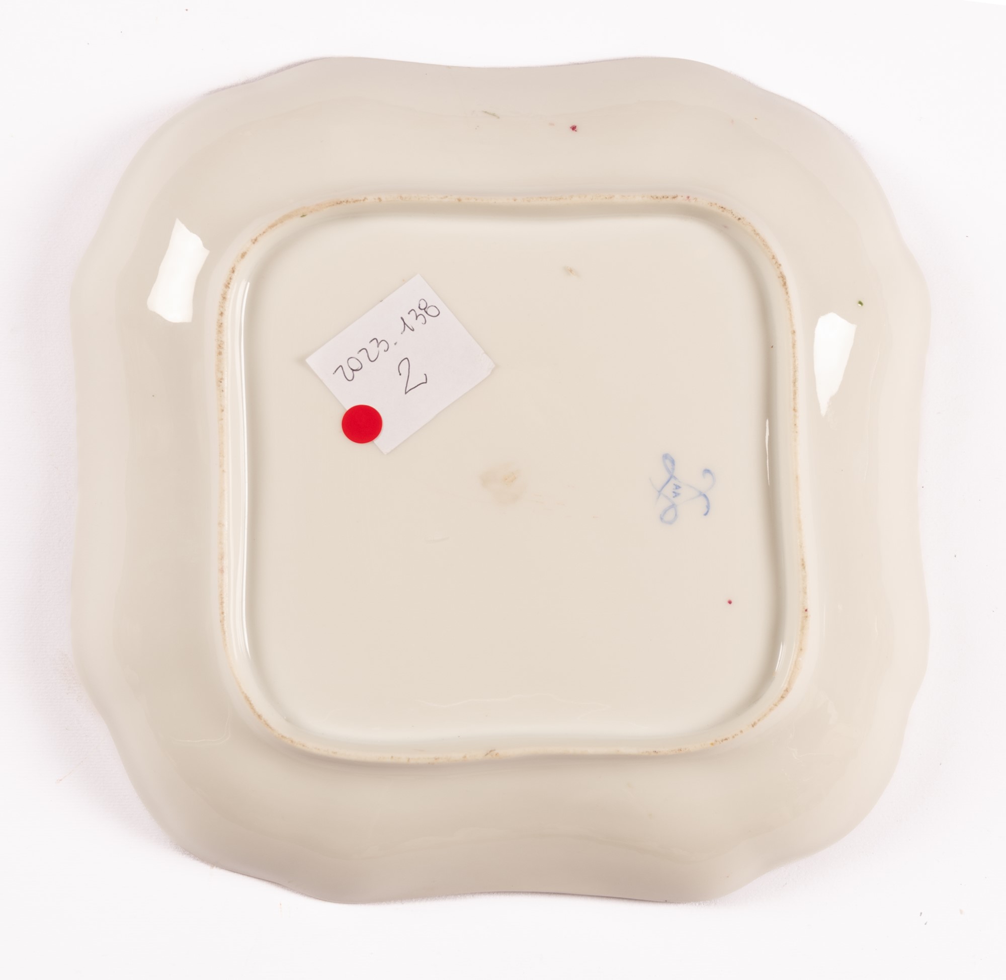 Piccolo vassoio quadrato in porcellana Sevres con decoro a treillage alternato da riserve con mazzetti floreali di rose unite da ghirlande. XVIII secolo