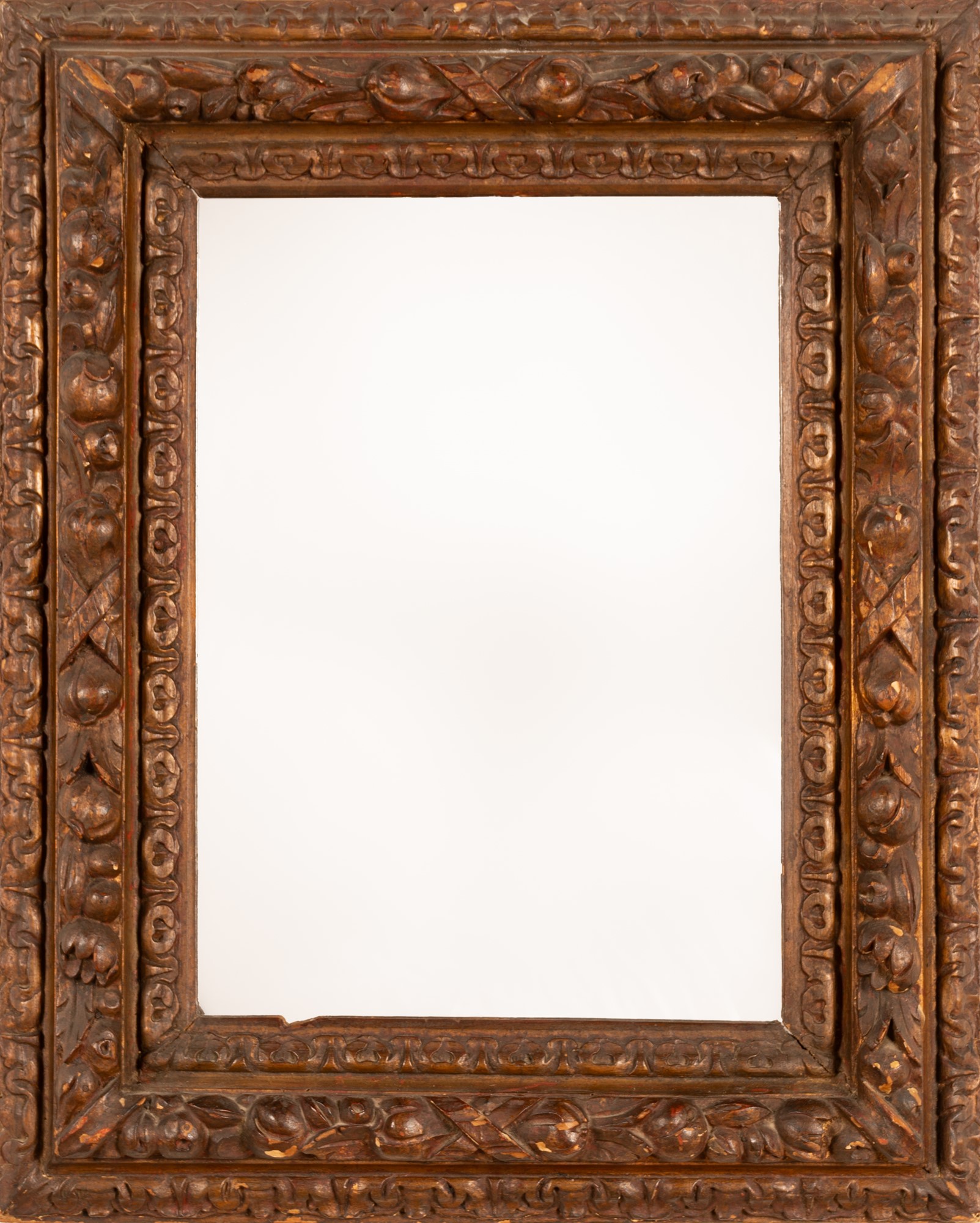 dimensioni specchio 49x34,5 cm; dimensioni cornice 72x58 cm Tre ordini di modanature a palmette e frutti