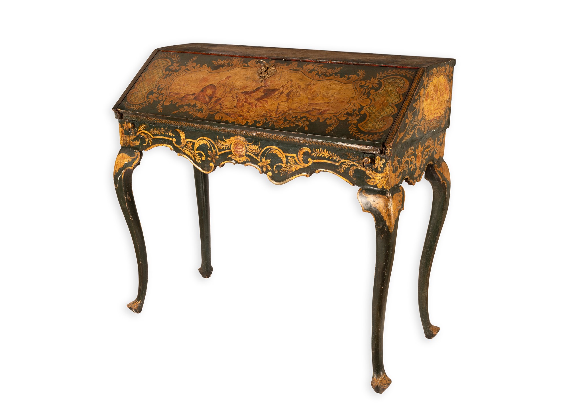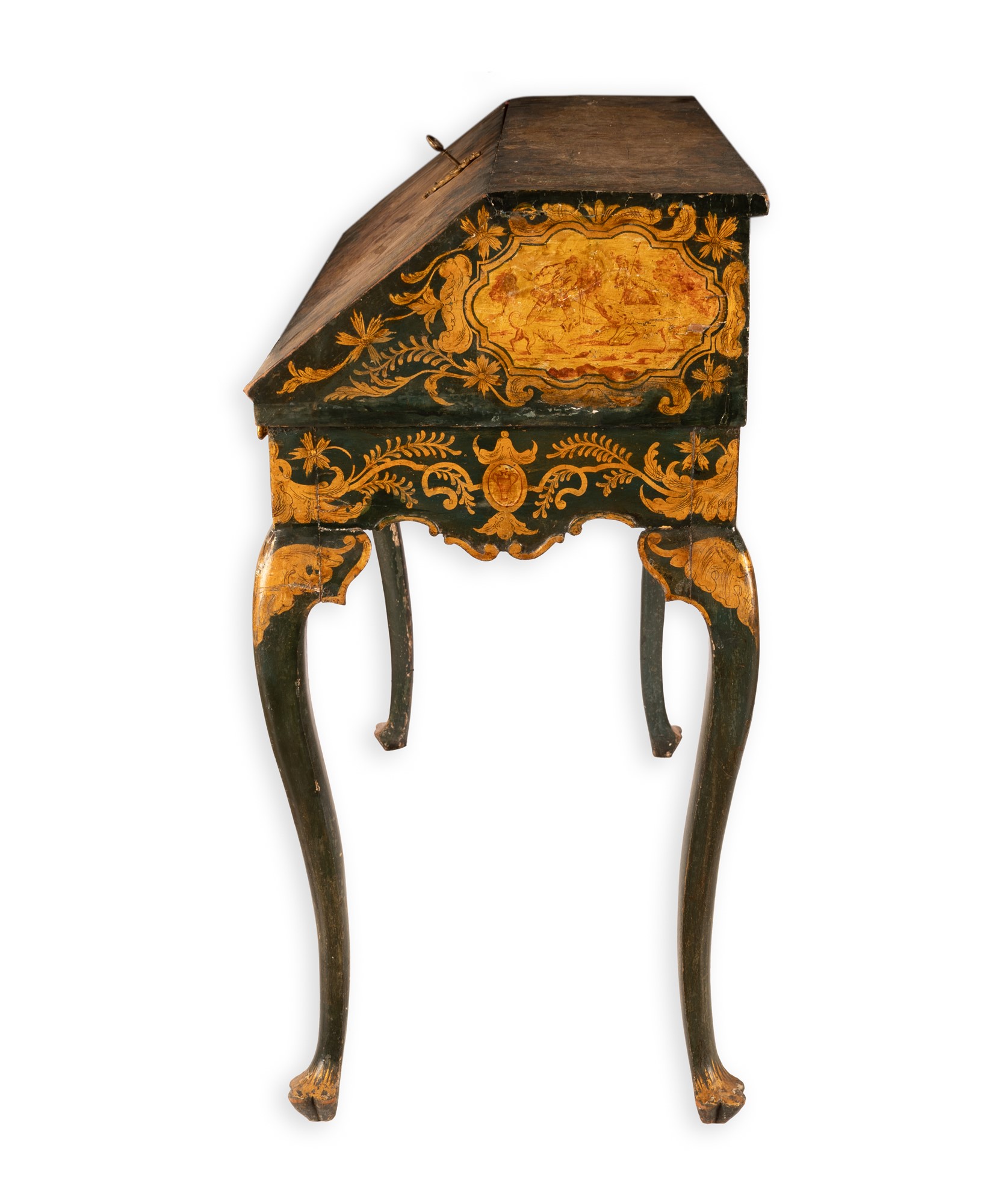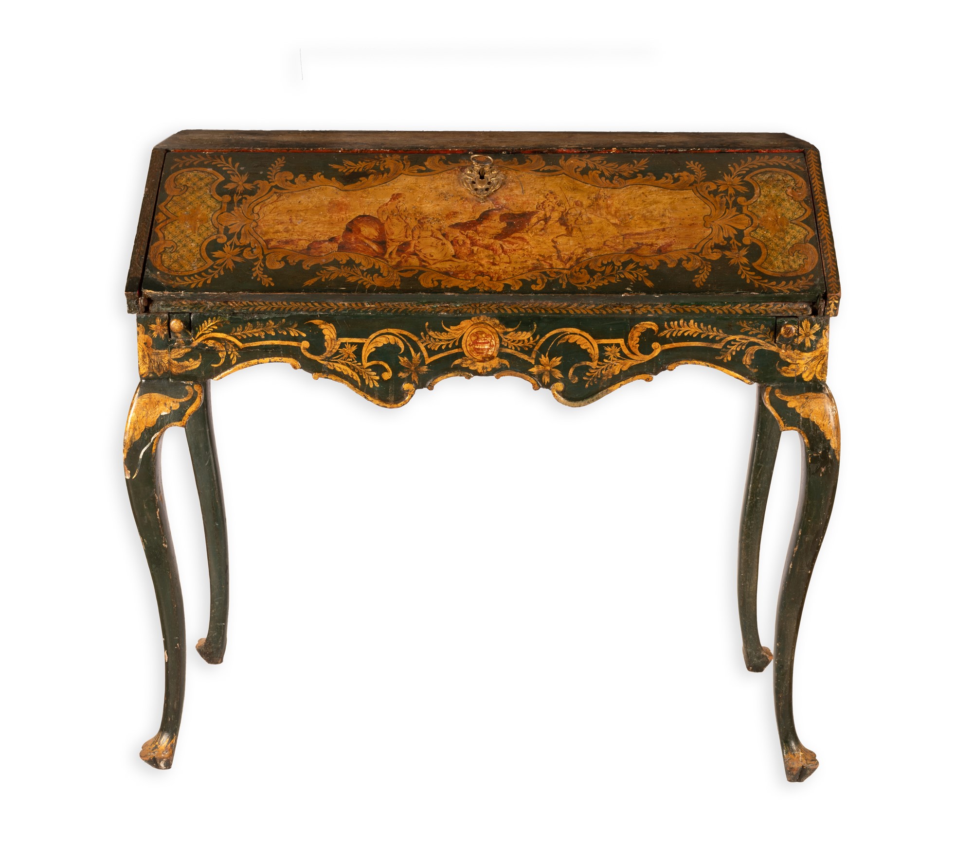 Scrittoio a ribalta per signora in legno laccato a fondo verde e dorato, con riserve a cartigli in giallo e manganese dipinte con scene bucoliche sul calatoio e a serti fioriti sul piano superiore. Manifattura siciliana del XVIII secolo
