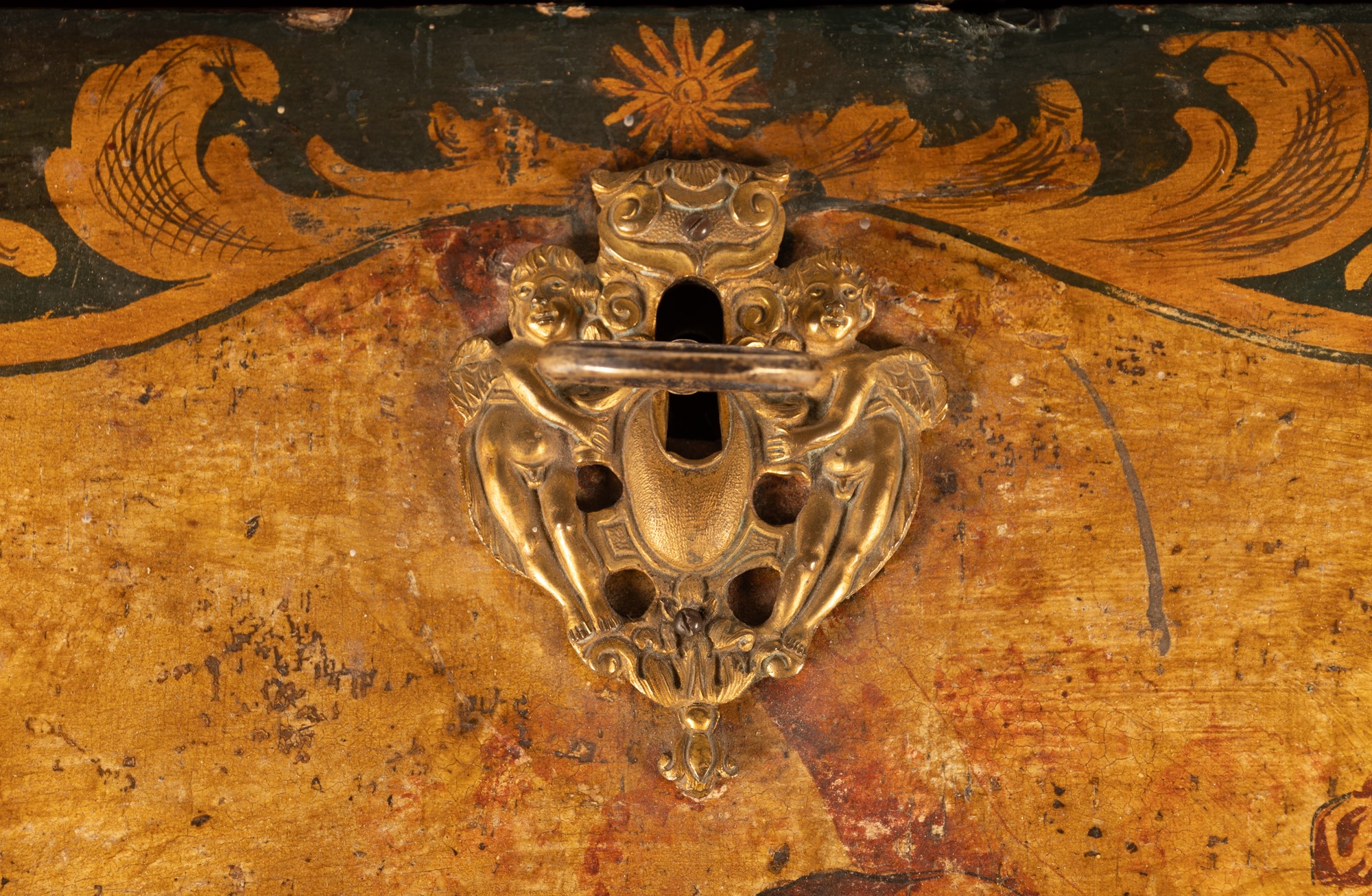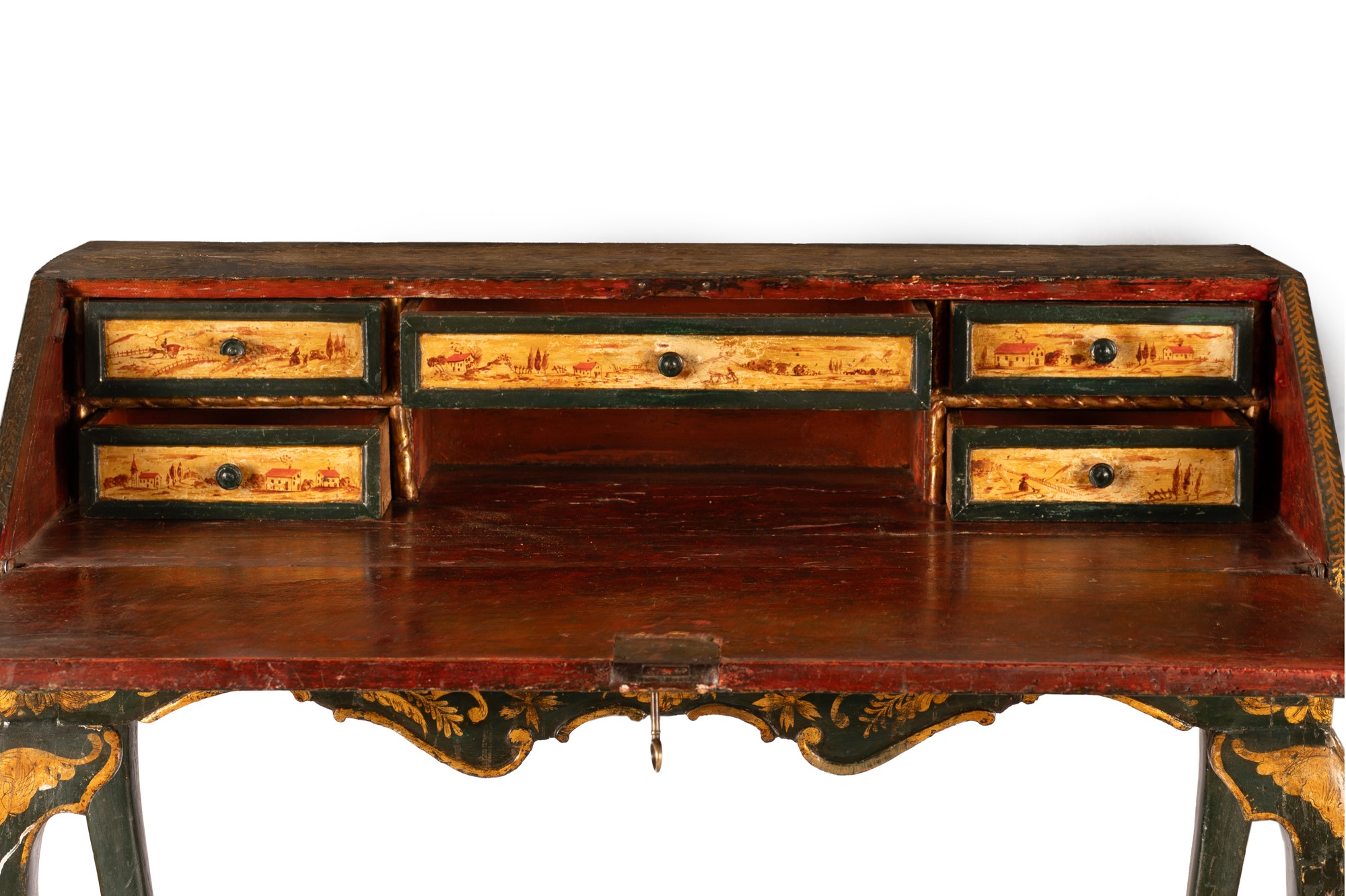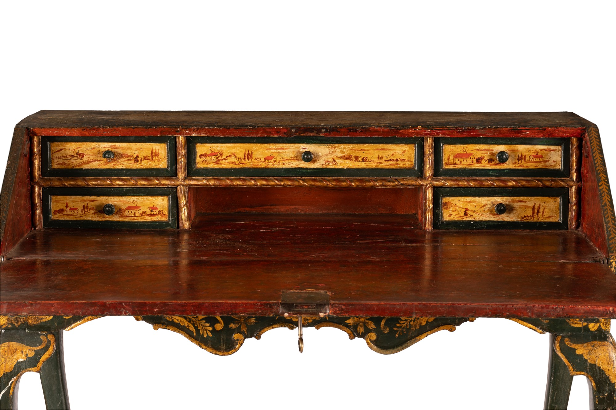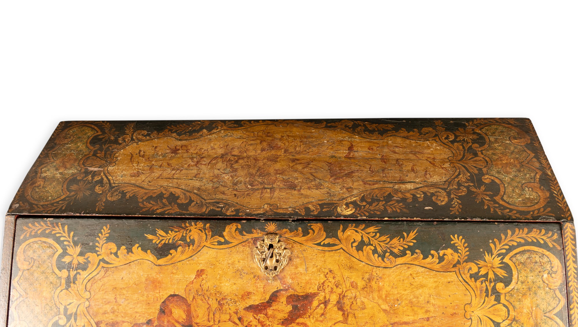 Scrittoio a ribalta per signora in legno laccato a fondo verde e dorato, con riserve a cartigli in giallo e manganese dipinte con scene bucoliche sul calatoio e a serti fioriti sul piano superiore. Manifattura siciliana del XVIII secolo
