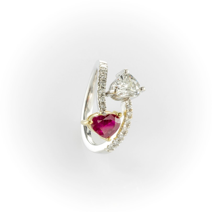 Lotto 143 | Anello contrariè in oro bianco e giallo con un diamante e un rubino taglio a cuore contrapposti e pavè di diamanti sul gambo