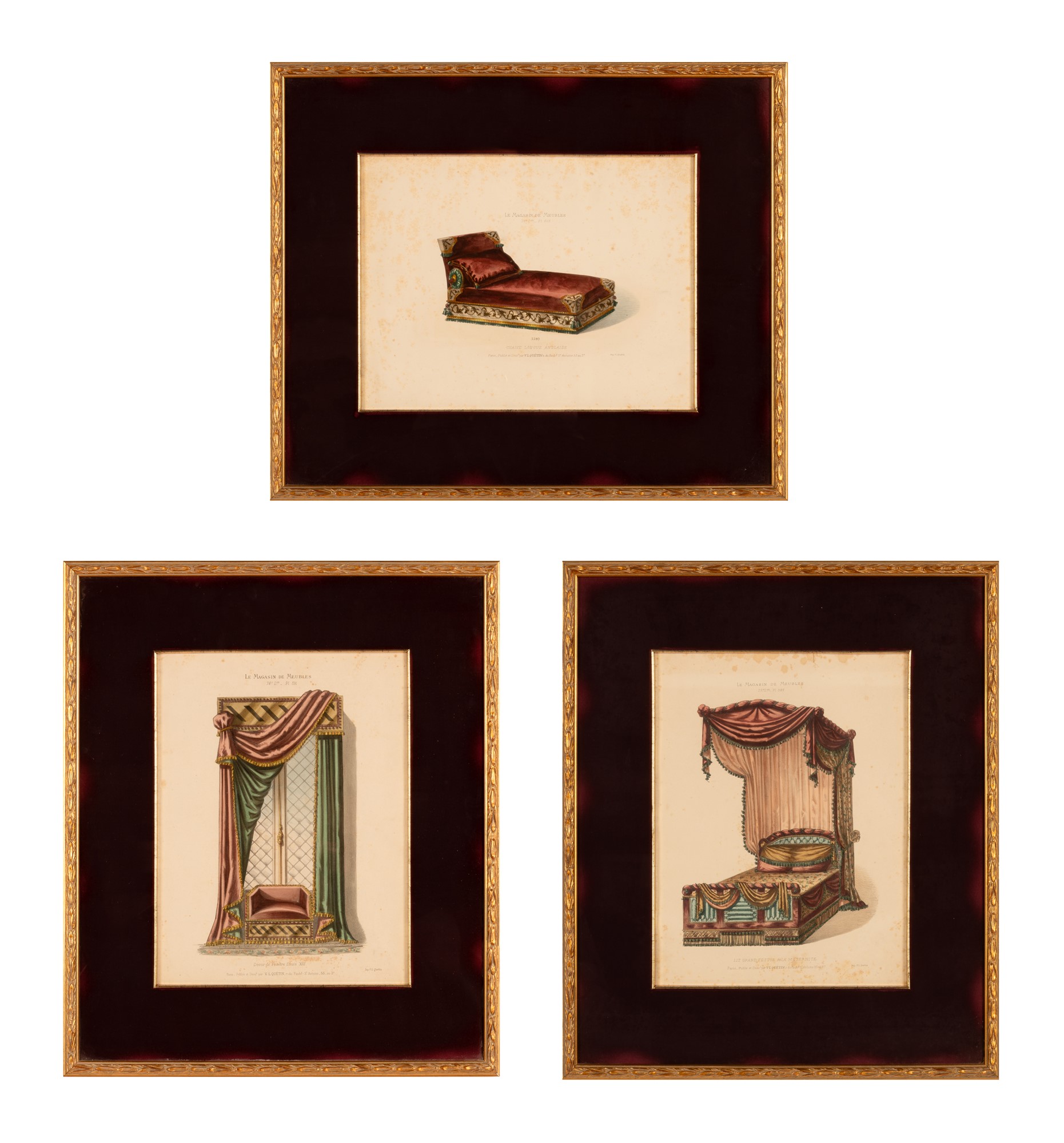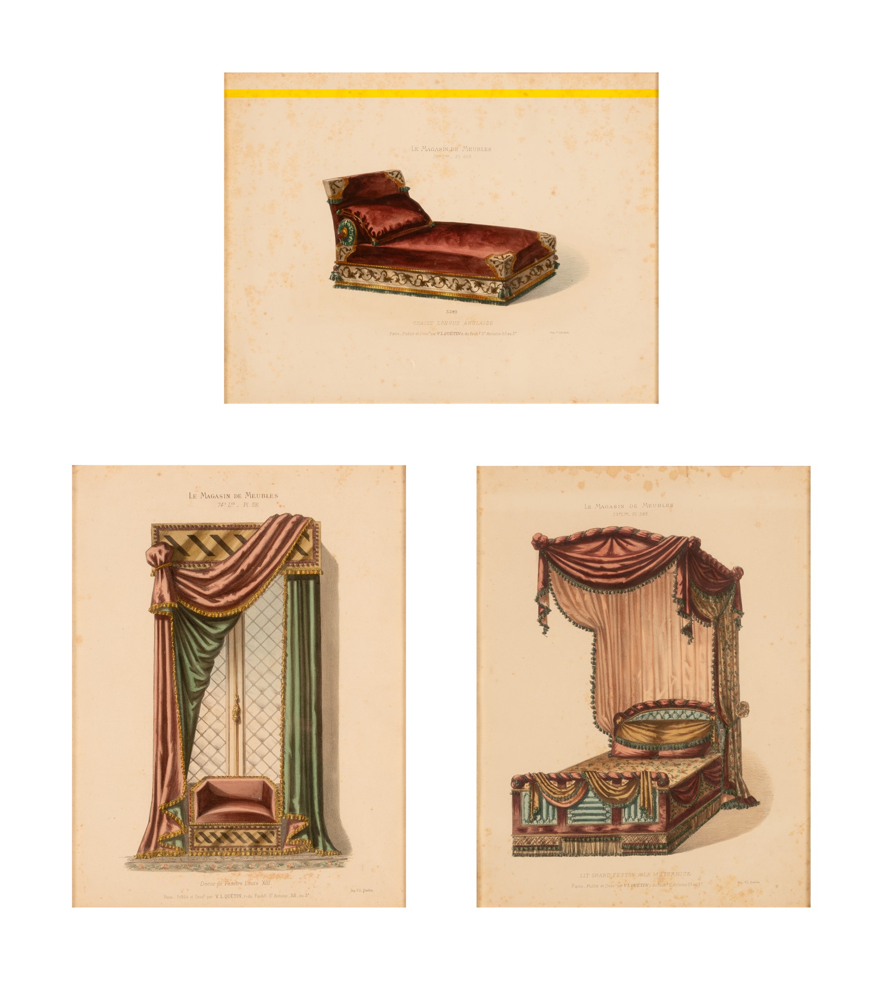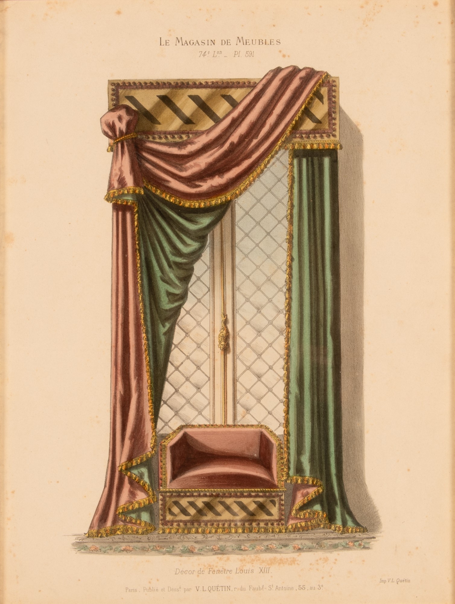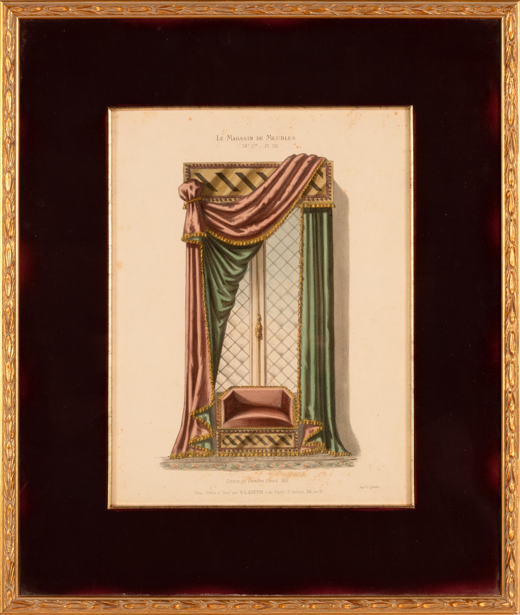 Victor L. Quéntin. Lotto di tre incisioni colorate dal libro delle tende, "Le Magasin De Meubles", raffiguranti finestre elaborate a Parigi risalenti ai secoli XVIII e XIX