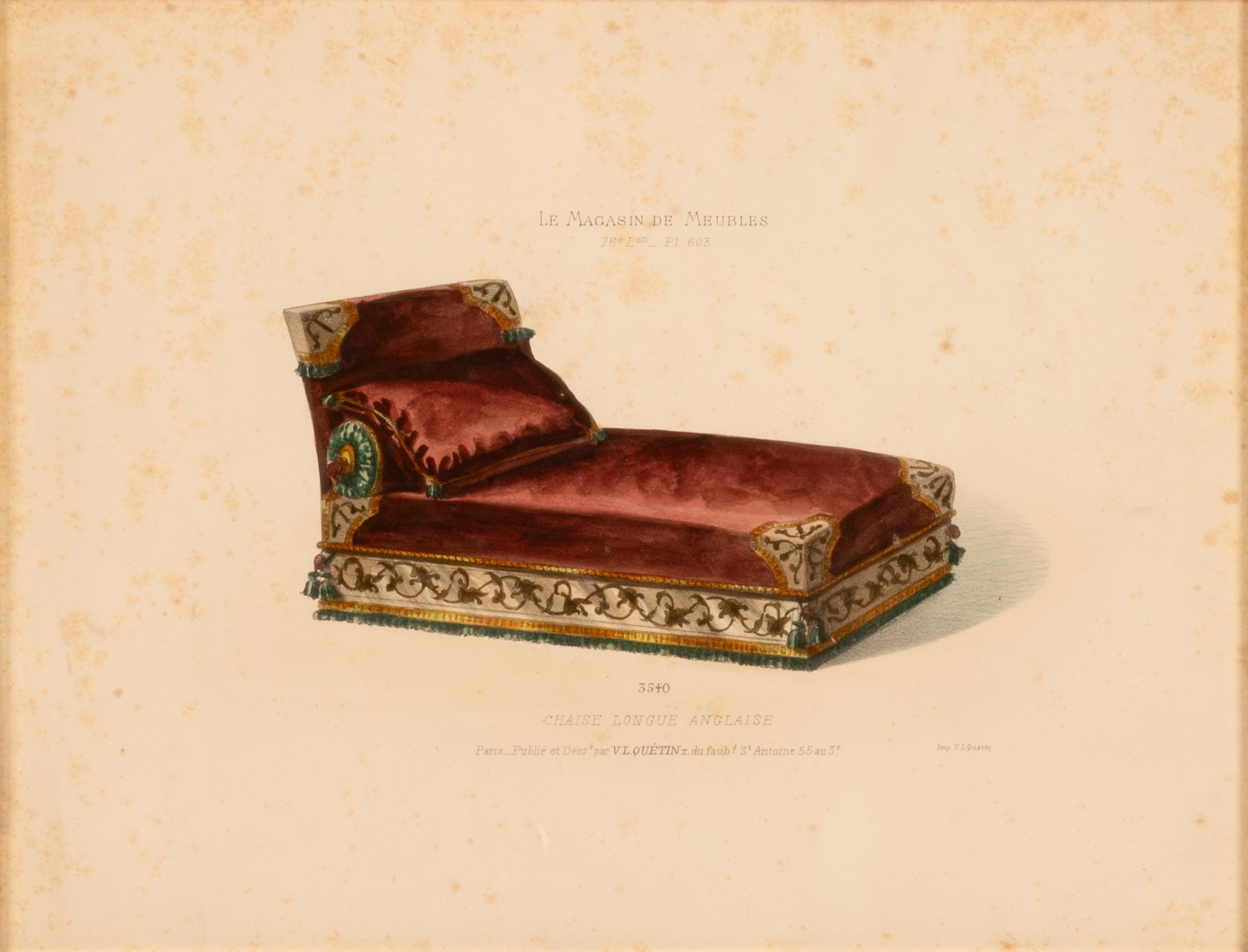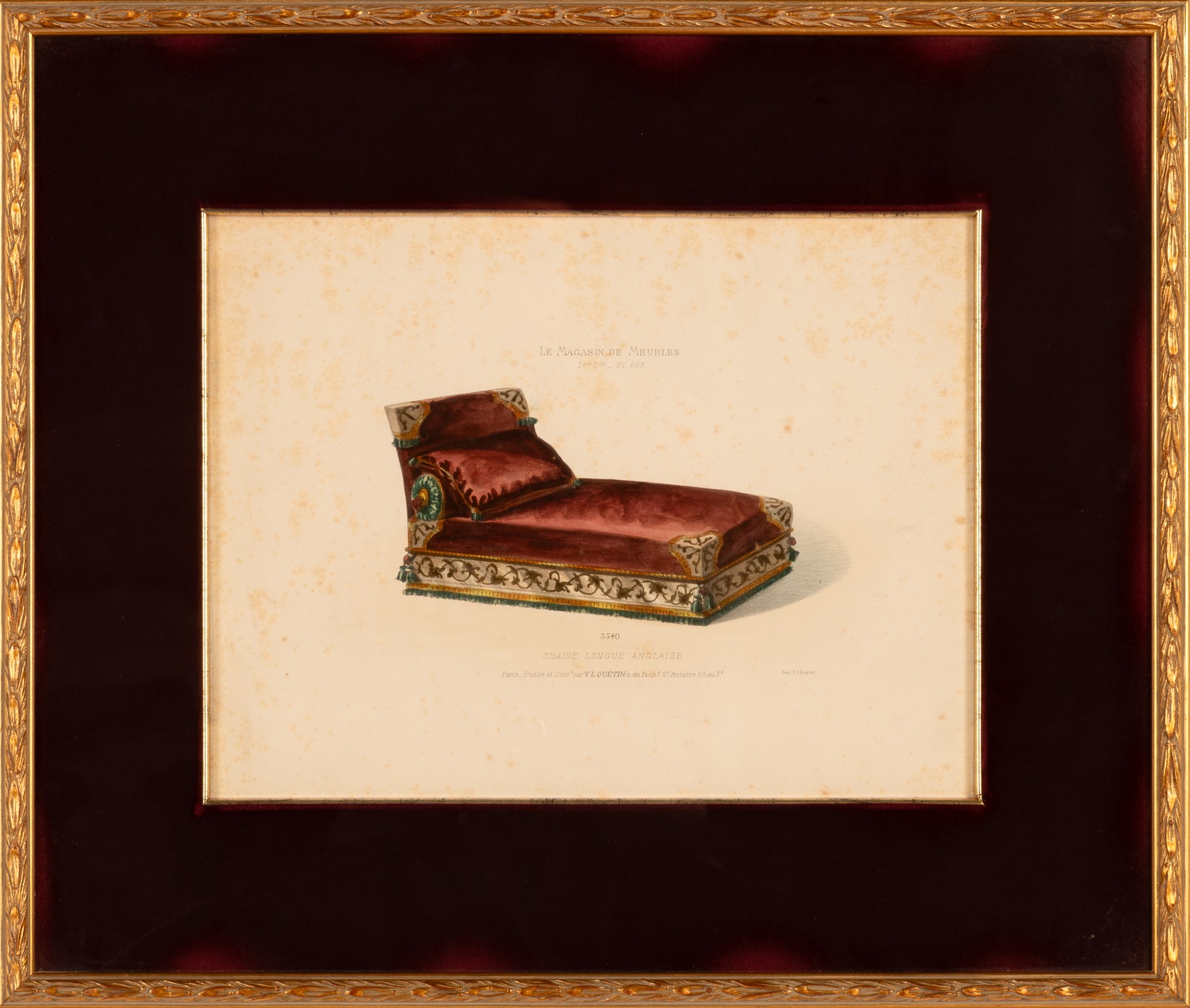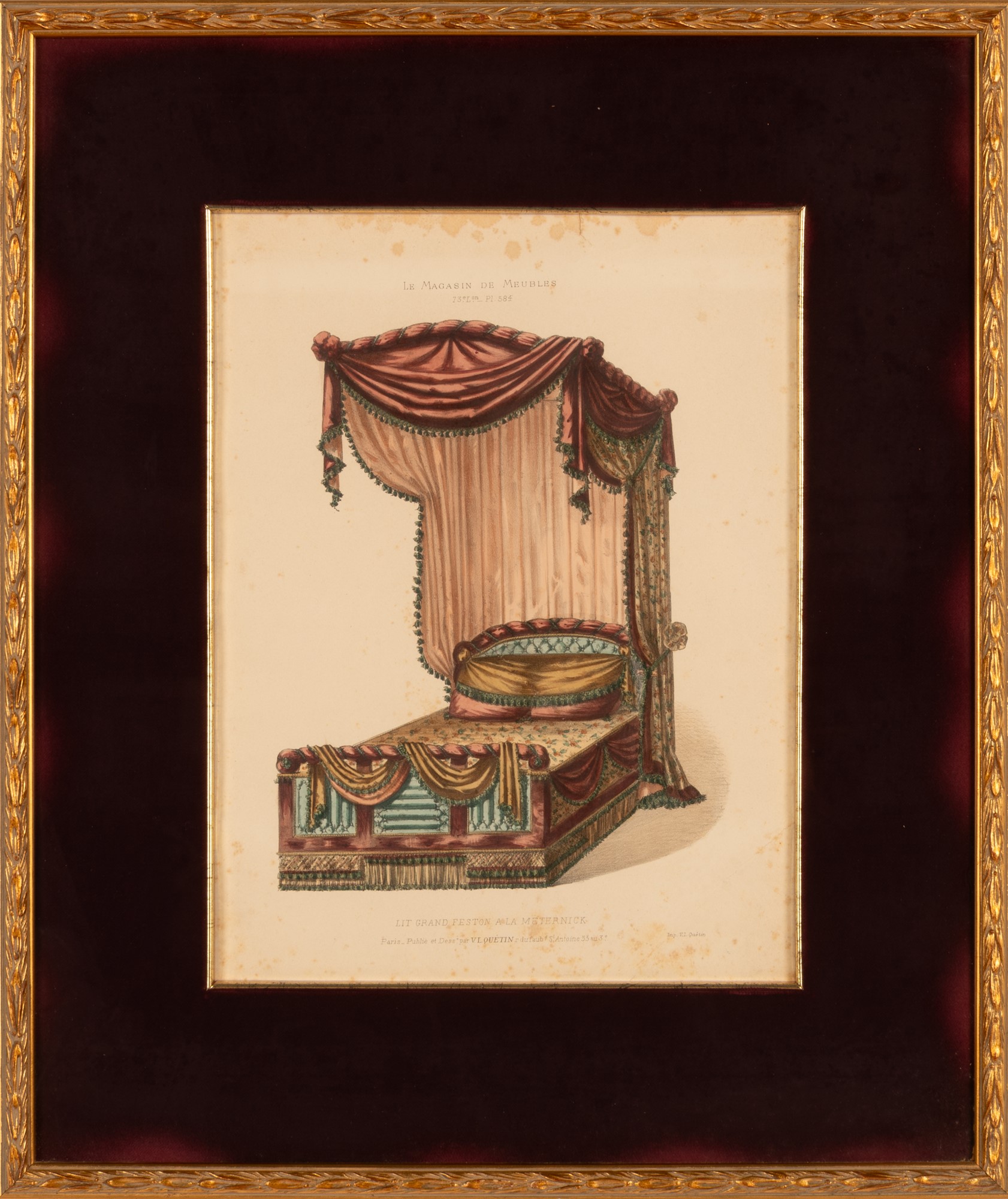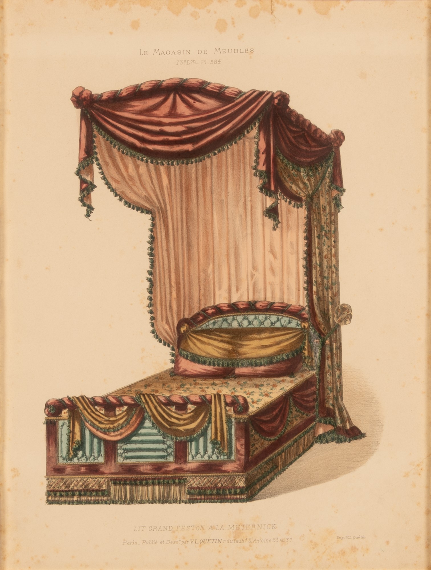 Victor L. Quéntin. Lotto di tre incisioni colorate dal libro delle tende, "Le Magasin De Meubles", raffiguranti finestre elaborate a Parigi risalenti ai secoli XVIII e XIX
