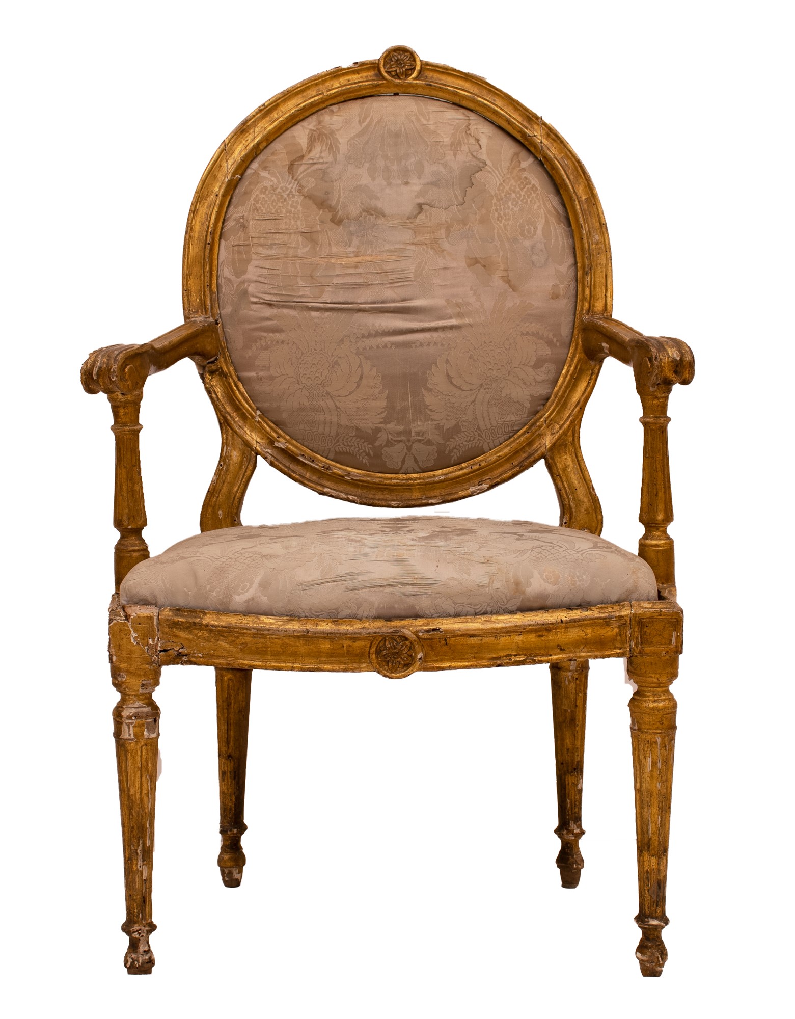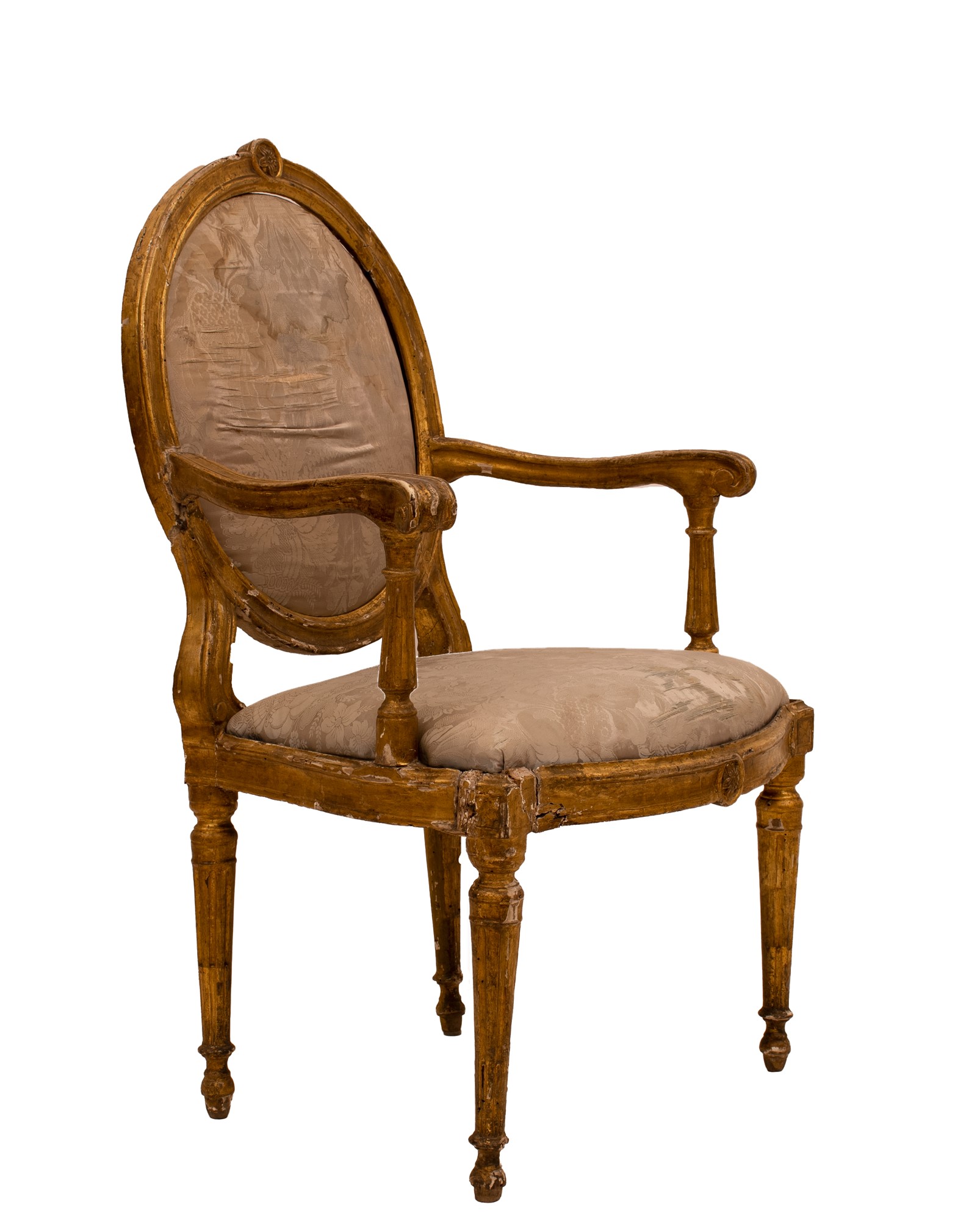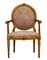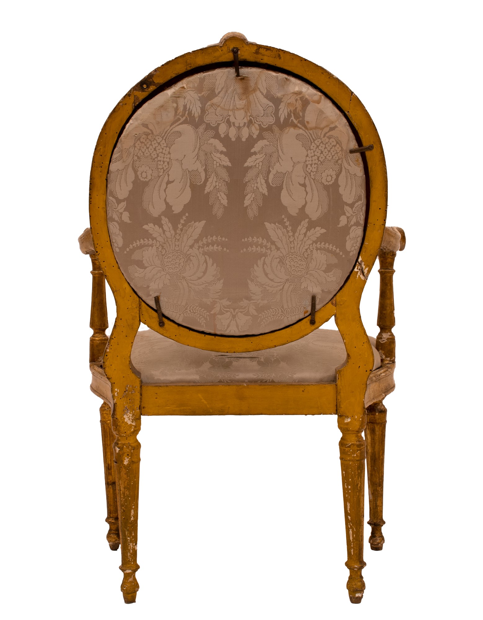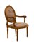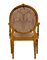 Schienale di frma ovale inquadrato da doppia bordatura liscia terminante in alto con un fregio a forma di fiore stilizzato che si ripete all'altezza della seduta.