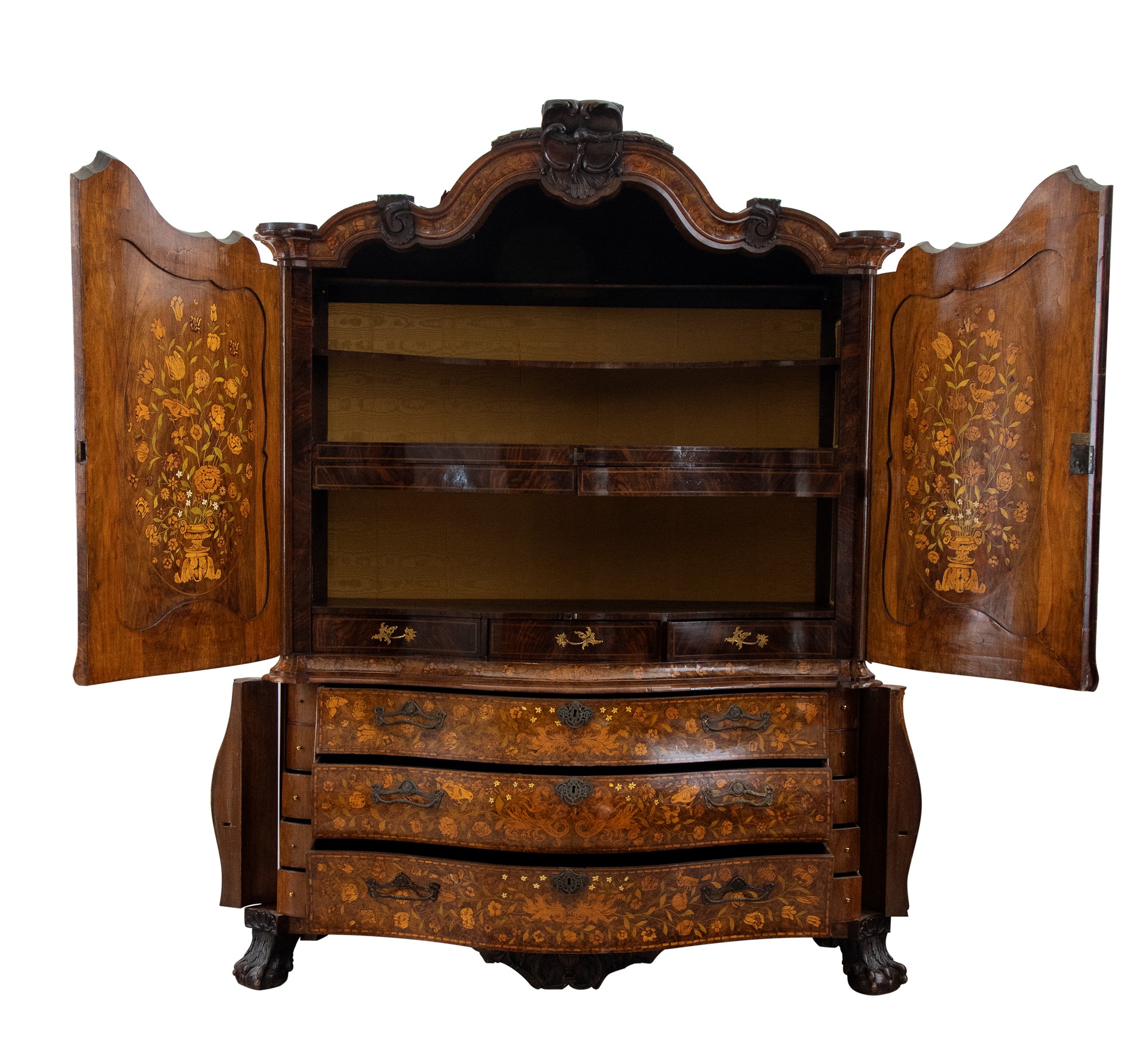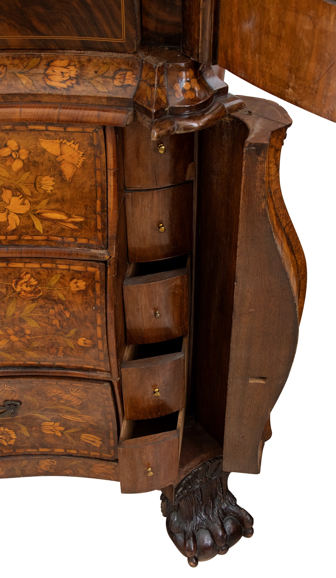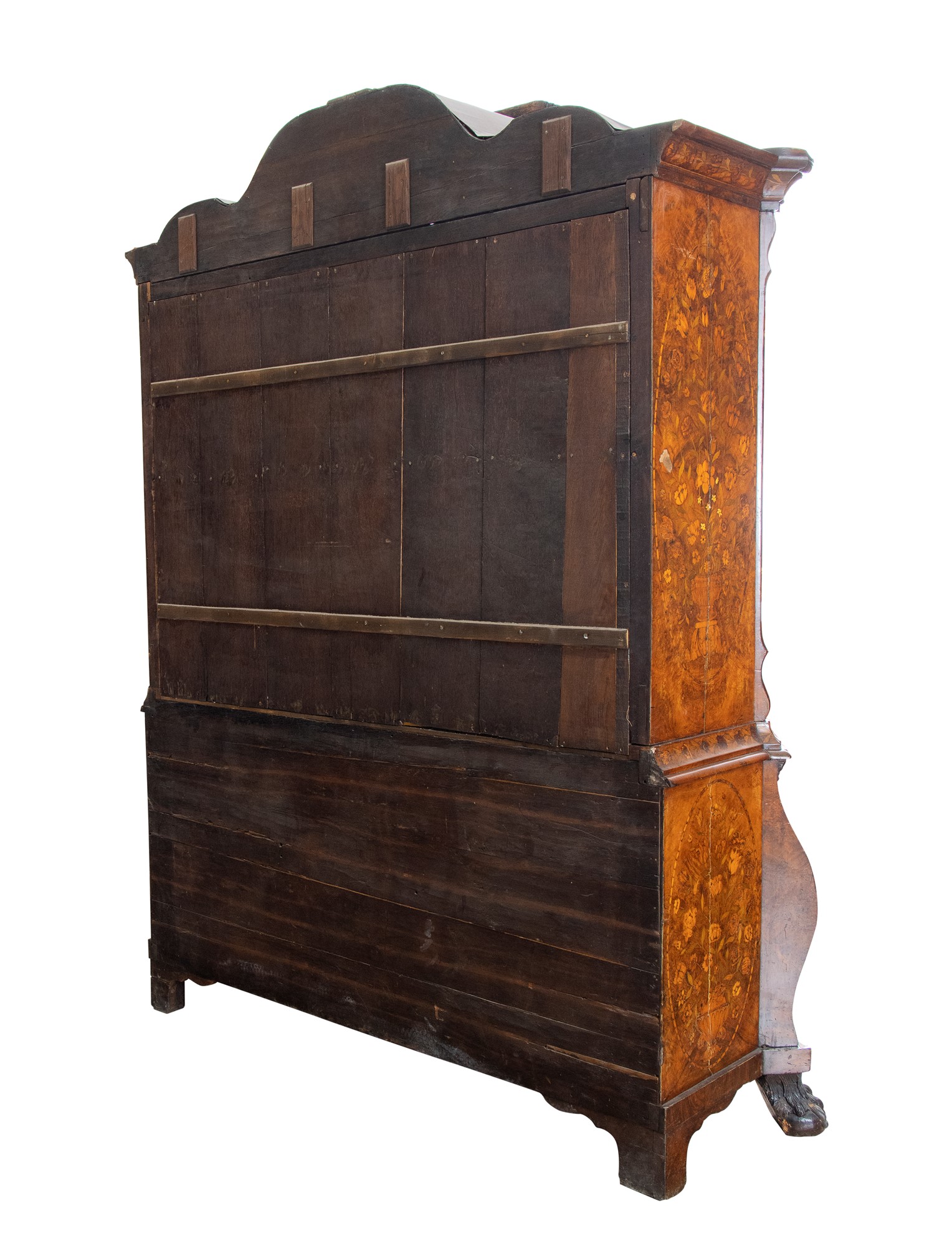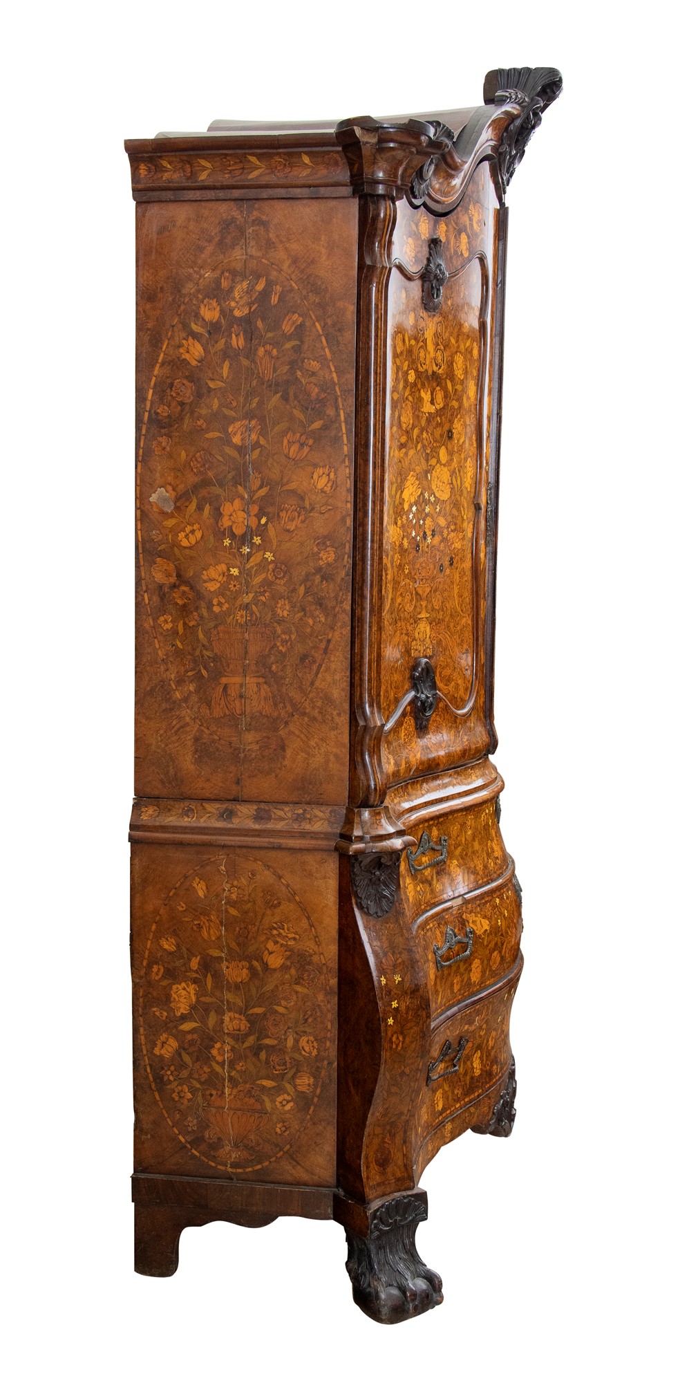 Corpo superiore a due sportelli lastronati in noce con ricchi intarsi in acero e altre essenze con vaso di fiori da cui dipartono motivi di tralci fogliacei fioriti, girali d'acanto e putti alati, sormontati da importante cappello modanato arricchito con inserti di volute e terminante in stemma araldico in noce ebanizzato. Sportelli intarsiati anche all'interno, su lastronatura di noce applicata su massello di rovere. L'interno presenta 4 ripiani, di cui due a mensola. Presente un ripiano con doppio ordine di cassetti lastronati e filettati. Più in basso 3 cassetti con maniglie in bronzo dorato