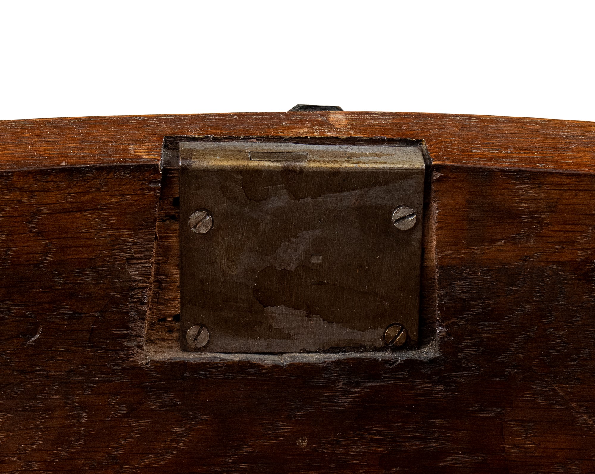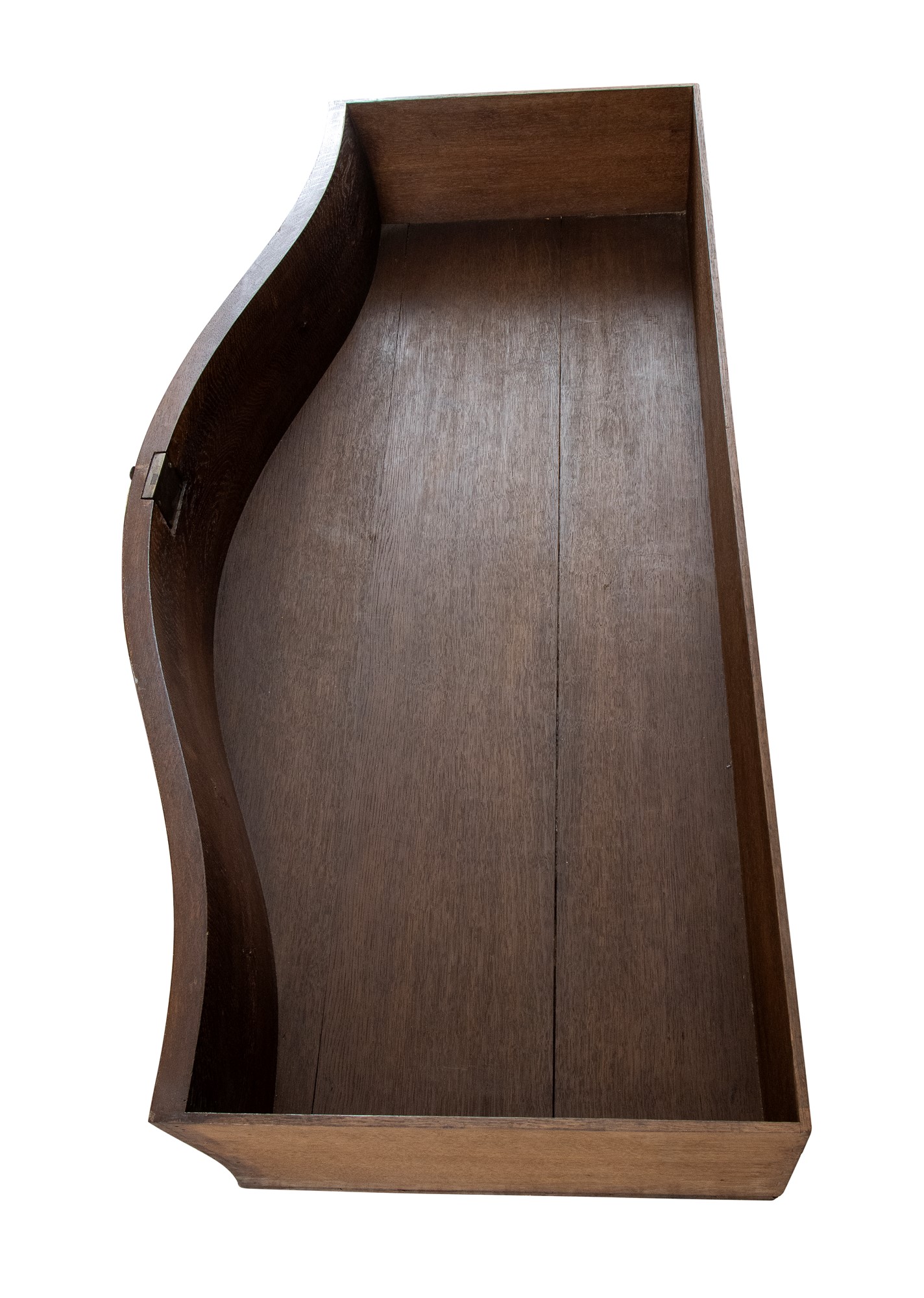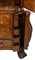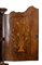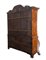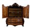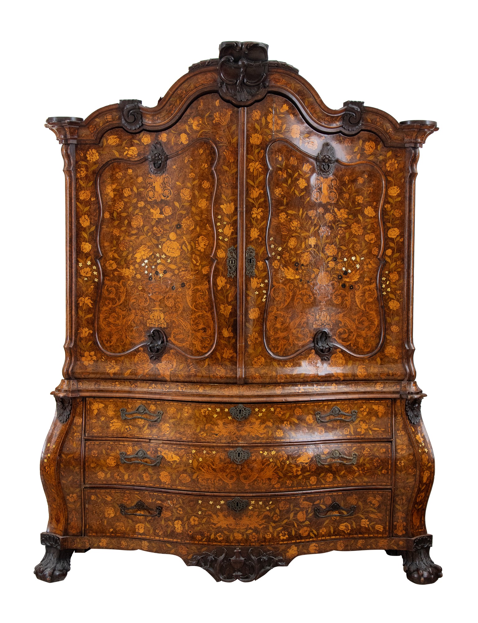 Corpo superiore a due sportelli lastronati in noce con ricchi intarsi in acero e altre essenze con vaso di fiori da cui dipartono motivi di tralci fogliacei fioriti, girali d'acanto e putti alati, sormontati da importante cappello modanato arricchito con inserti di volute e terminante in stemma araldico in noce ebanizzato. Sportelli intarsiati anche all'interno, su lastronatura di noce applicata su massello di rovere. L'interno presenta 4 ripiani, di cui due a mensola. Presente un ripiano con doppio ordine di cassetti lastronati e filettati. Più in basso 3 cassetti con maniglie in bronzo dorato