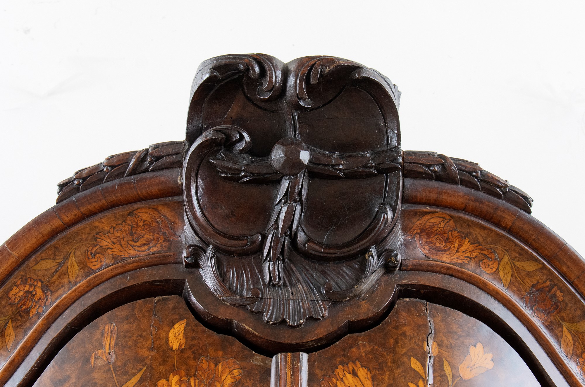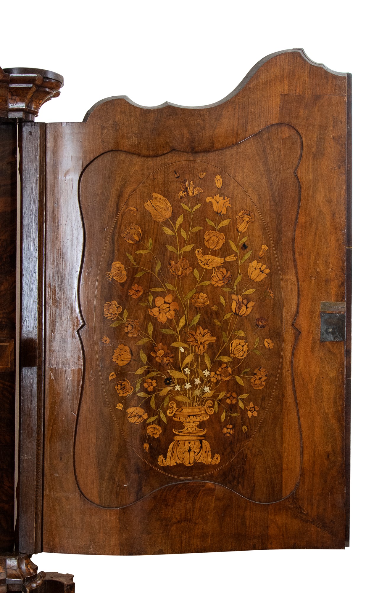 Grande ed importante trumeau olandese degli inizi del XVIII secolo in legno di rovere lastronato in noce e riccamente intagliato in varie essenze. Dettagli di piccoli fiori in madreperla e legno di noce ebanizzato. Fronte mosso e montanti scantonati.