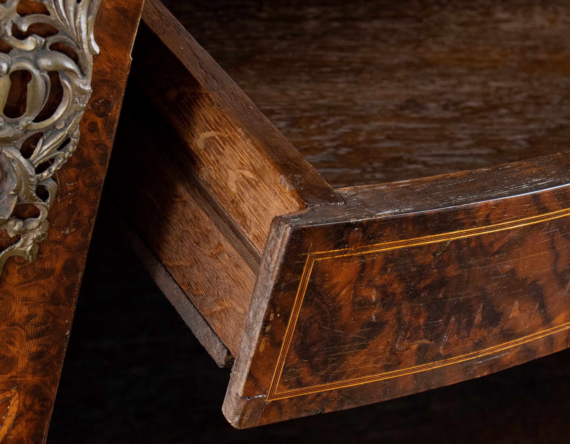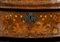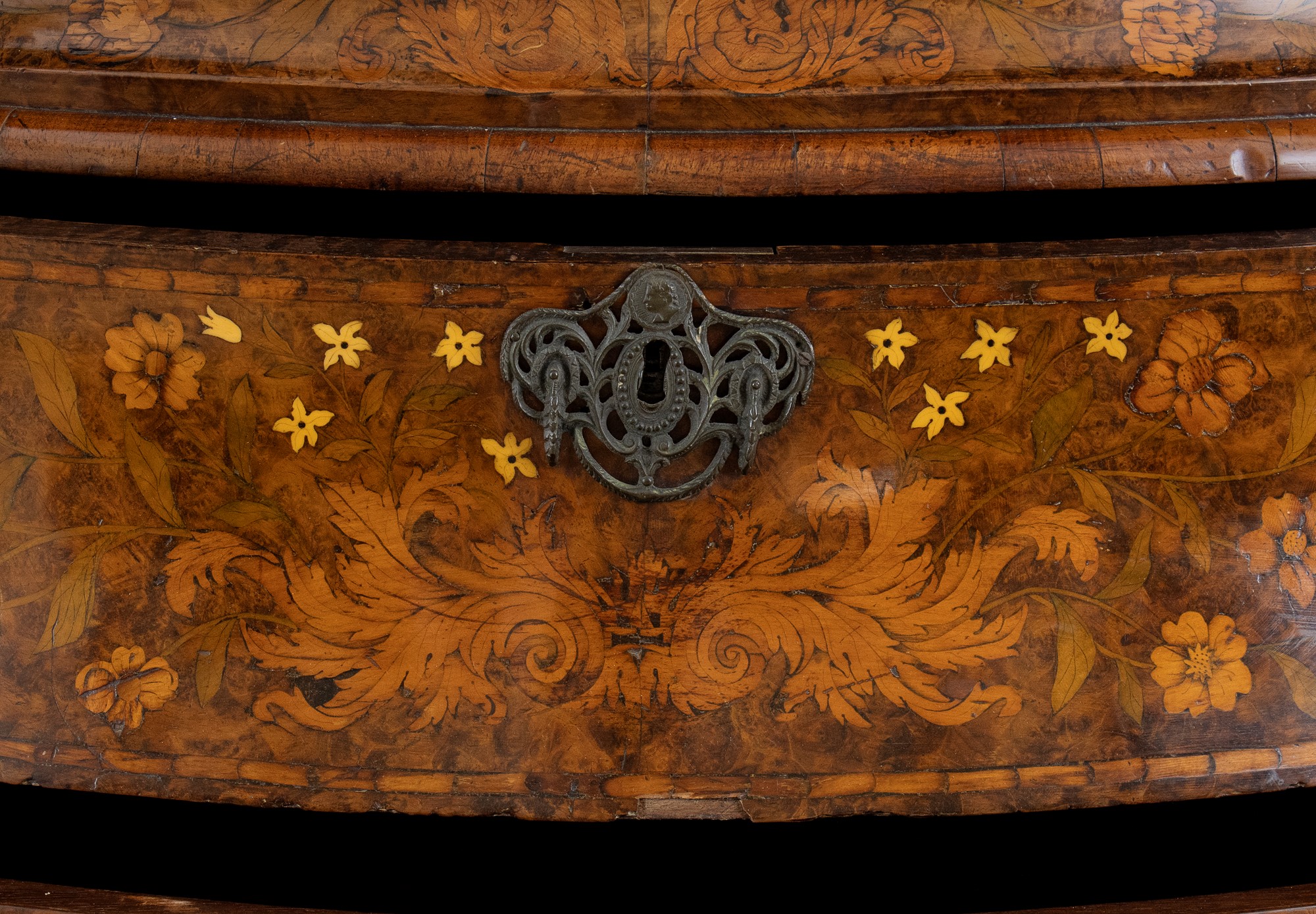 Il corpo inferiore a fronte mosso è suddiviso in 3 cassetti bombè interamente lastronati e intarsitati con elementi vegetali, floreali. l cassetto centrale è arricchito dalla presenza di due colombe all'altezza delle maniglie.