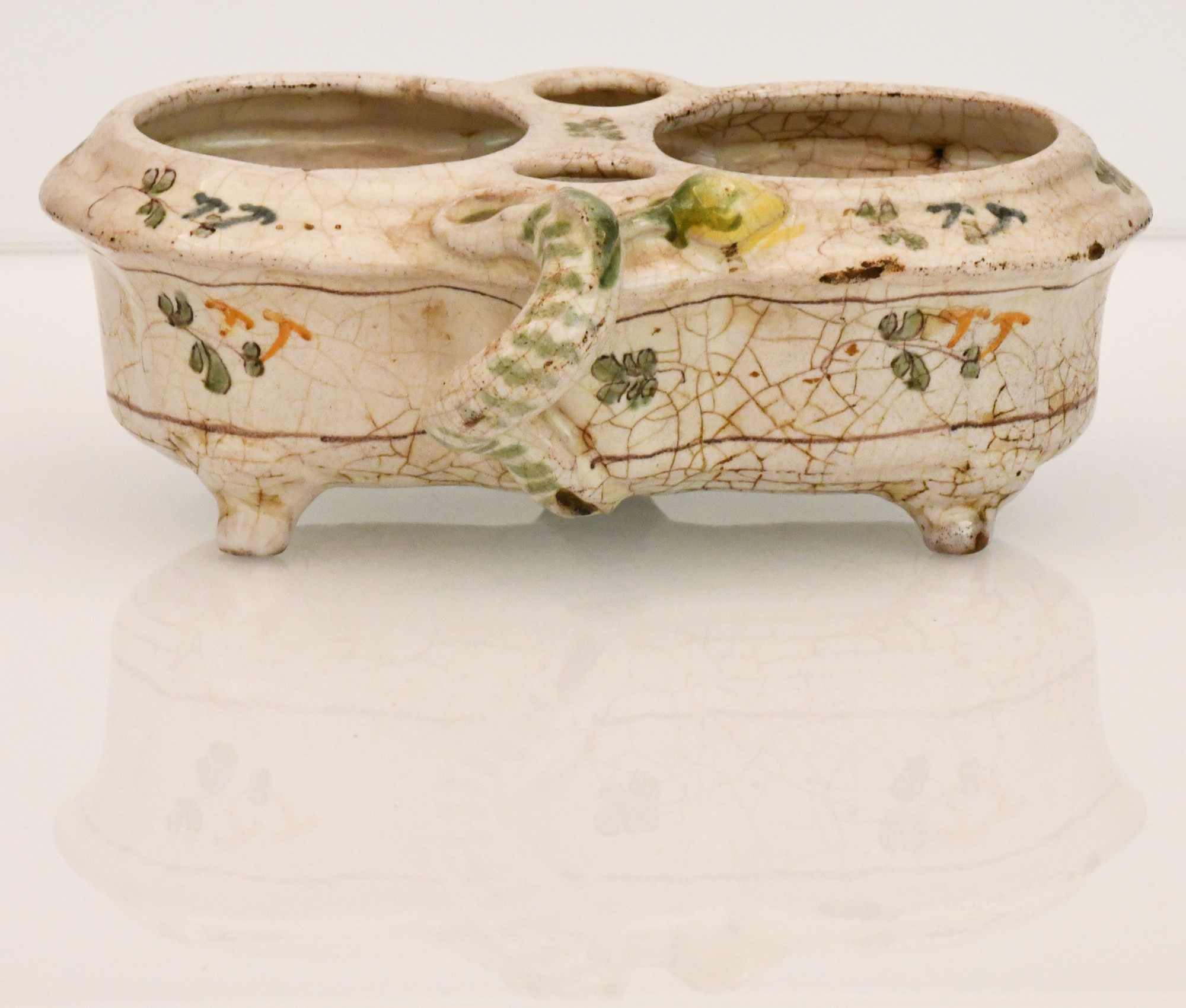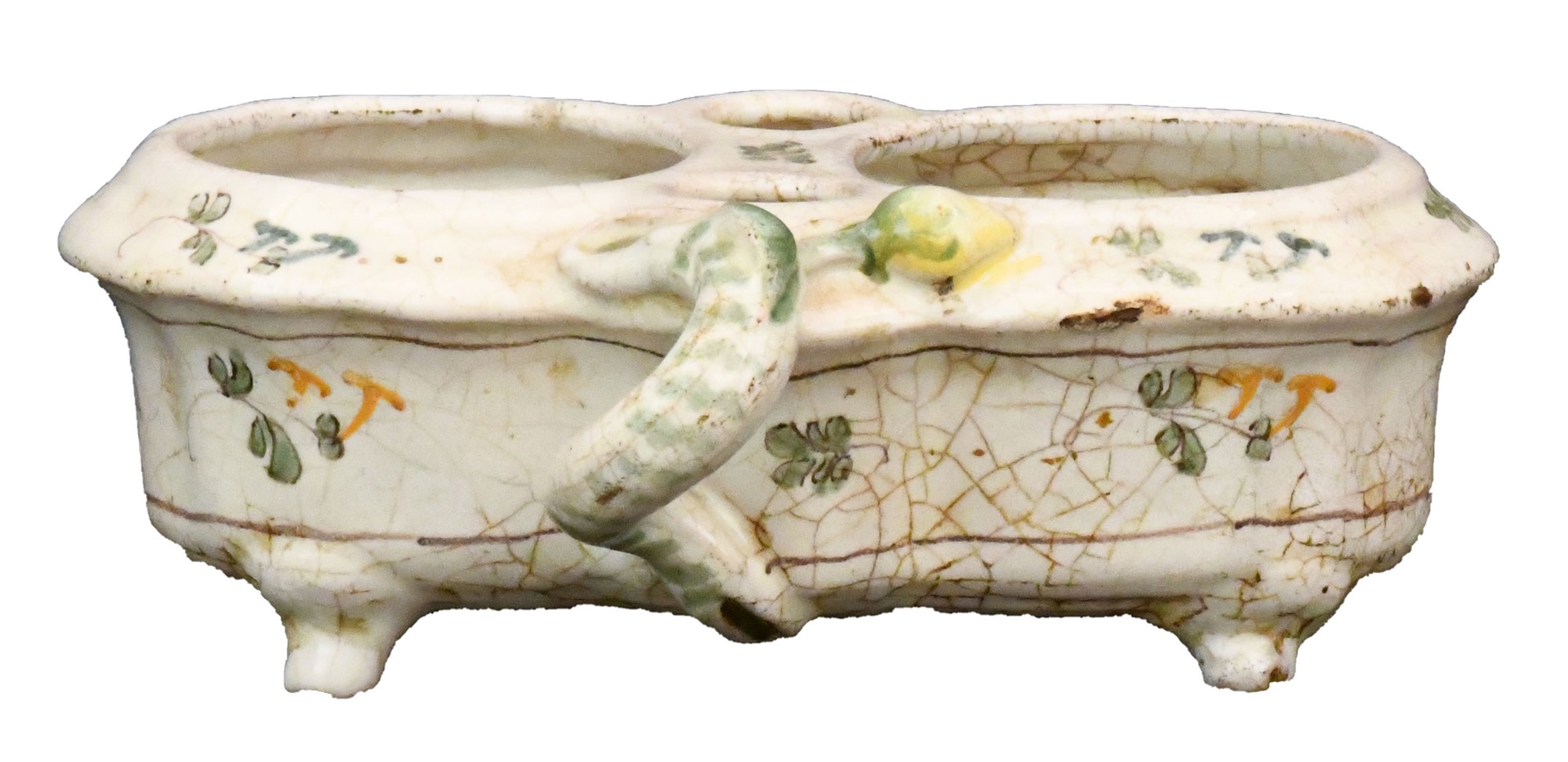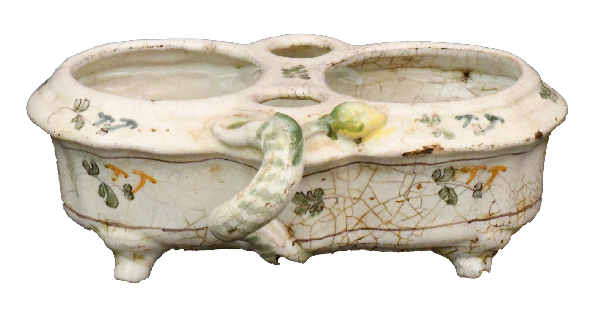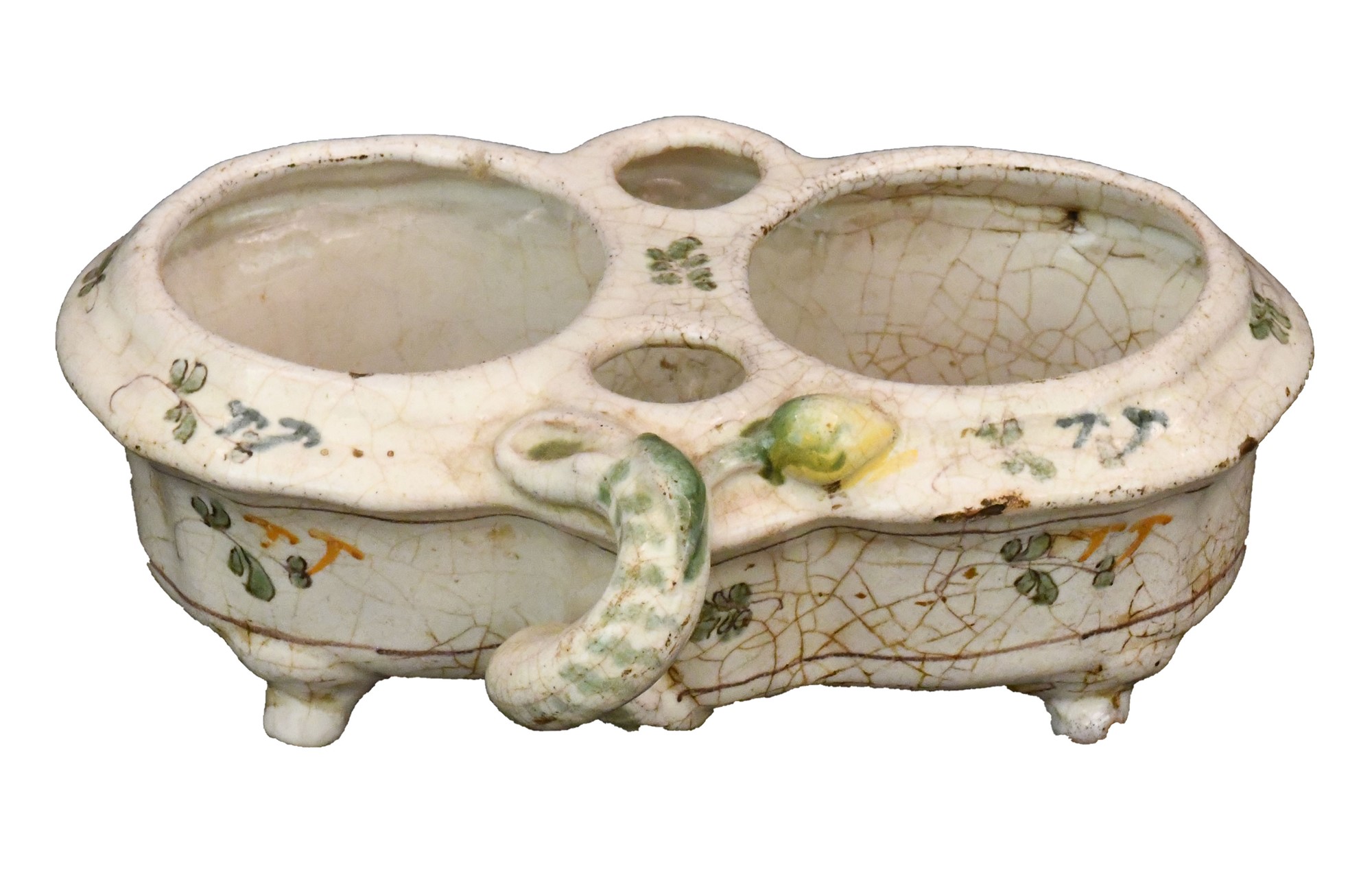 Oliera-saliera in maiolica decorata con delicati motivi floreali. Presa a serto fiorito. Manifattura di Cerreto Sannita, metà del XVIII secolo.