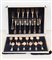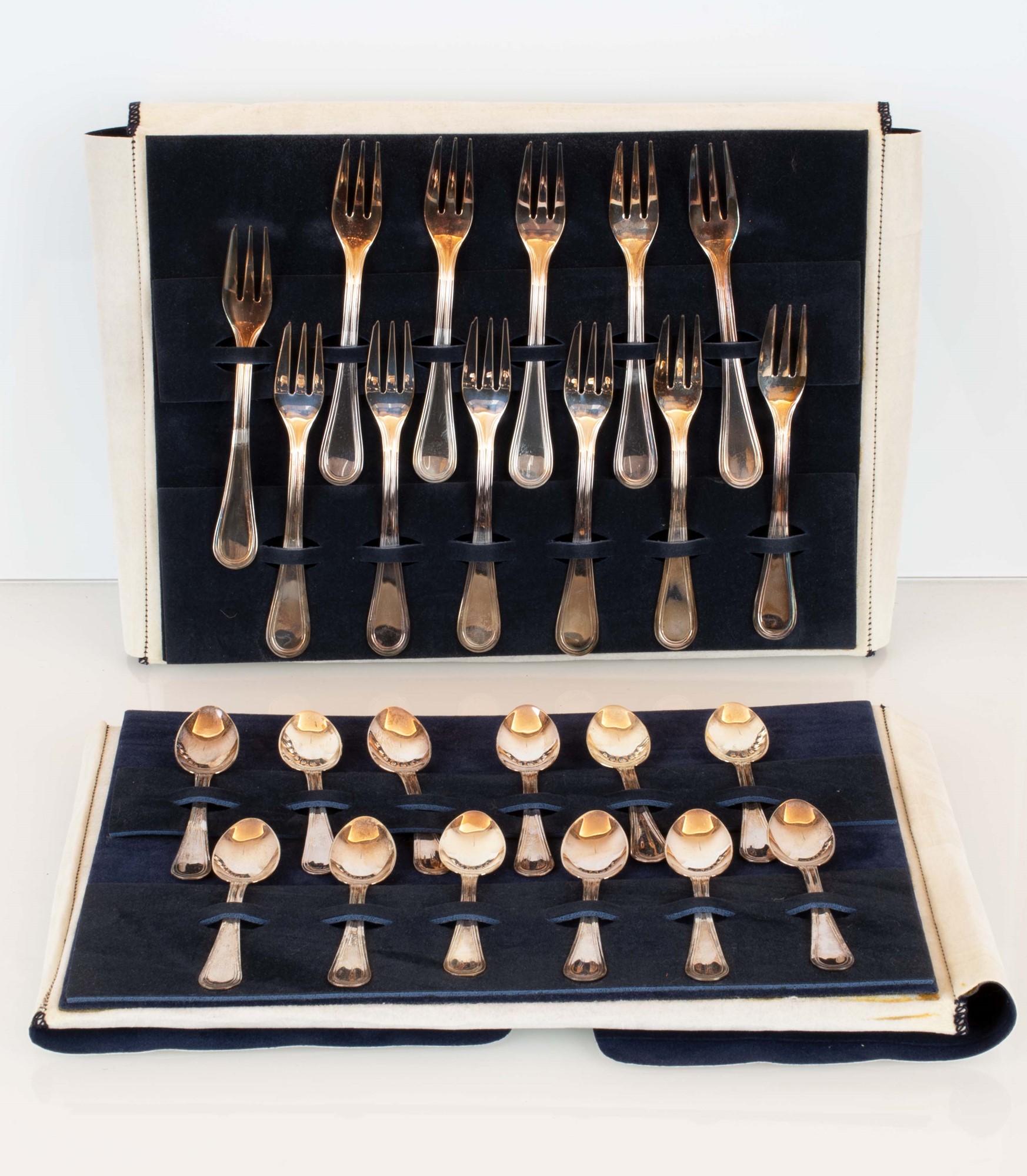 Servizio di cucchiaini da caffè in argento e forchettine da dolce in argento entro folder blu