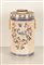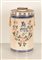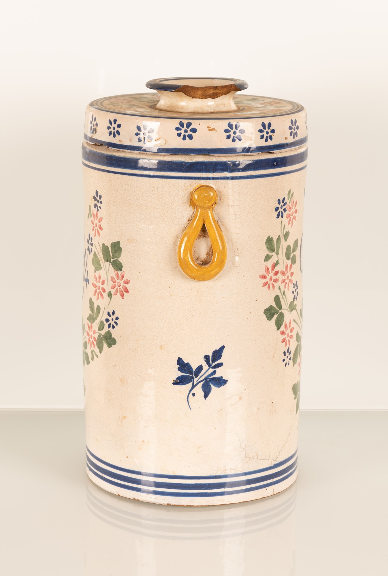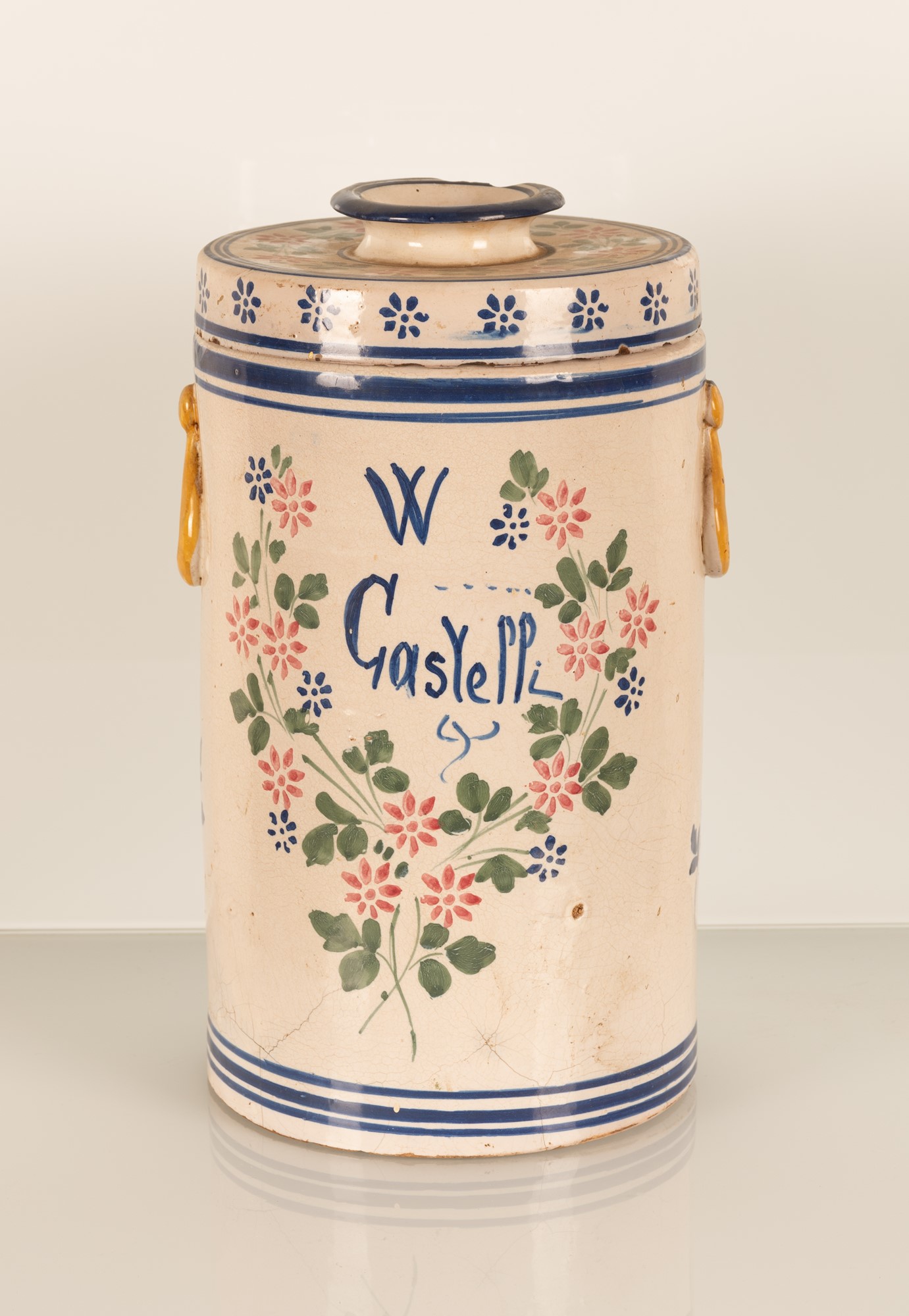Biscottiera con decoro fiorato blu sull’orlo e con serto di fiori rossi sul coperchio. Manifattura Castelli, 1914