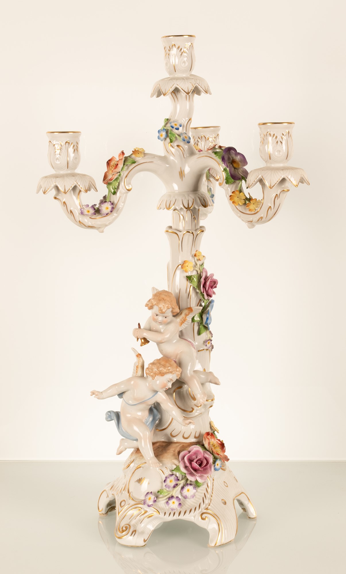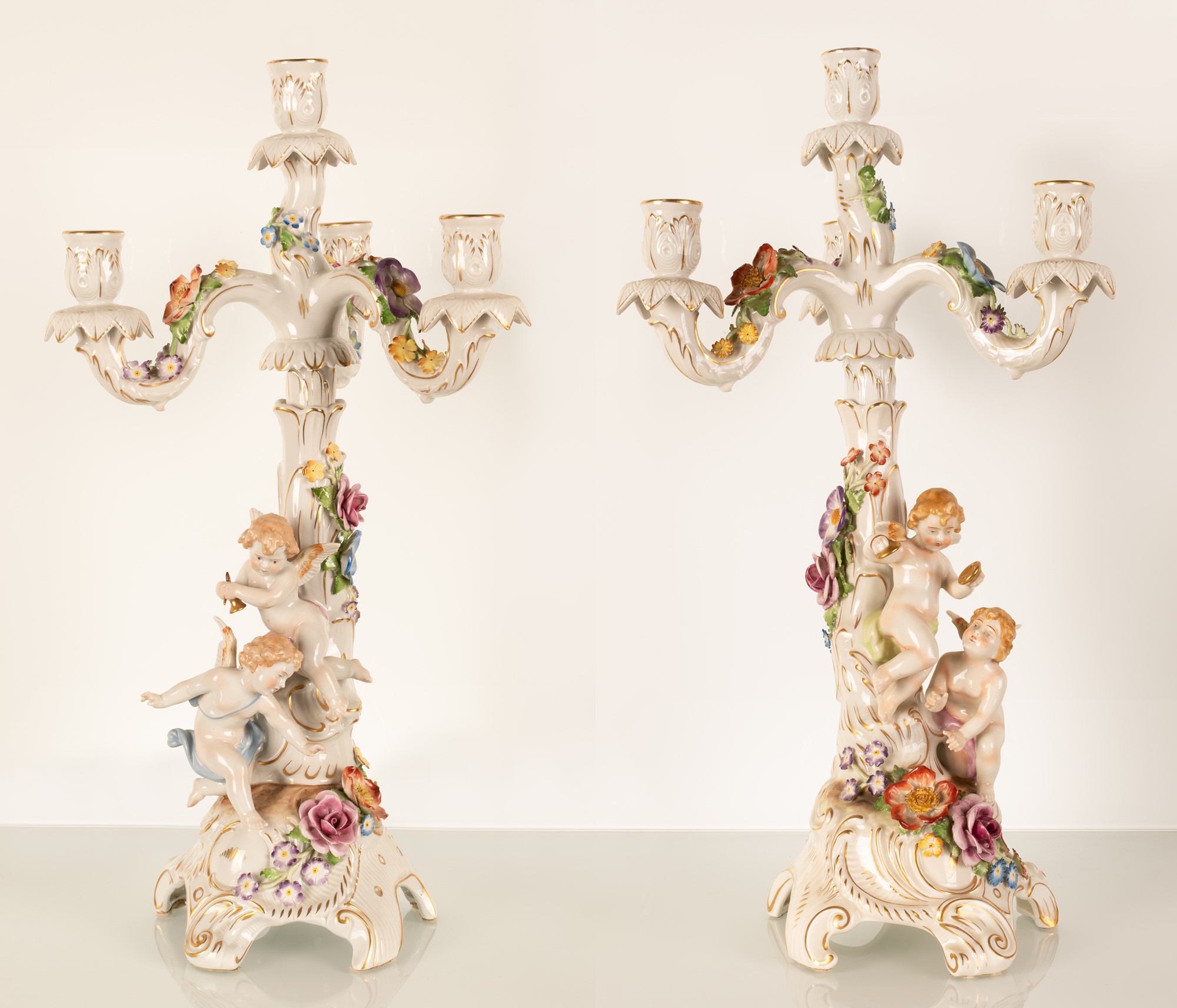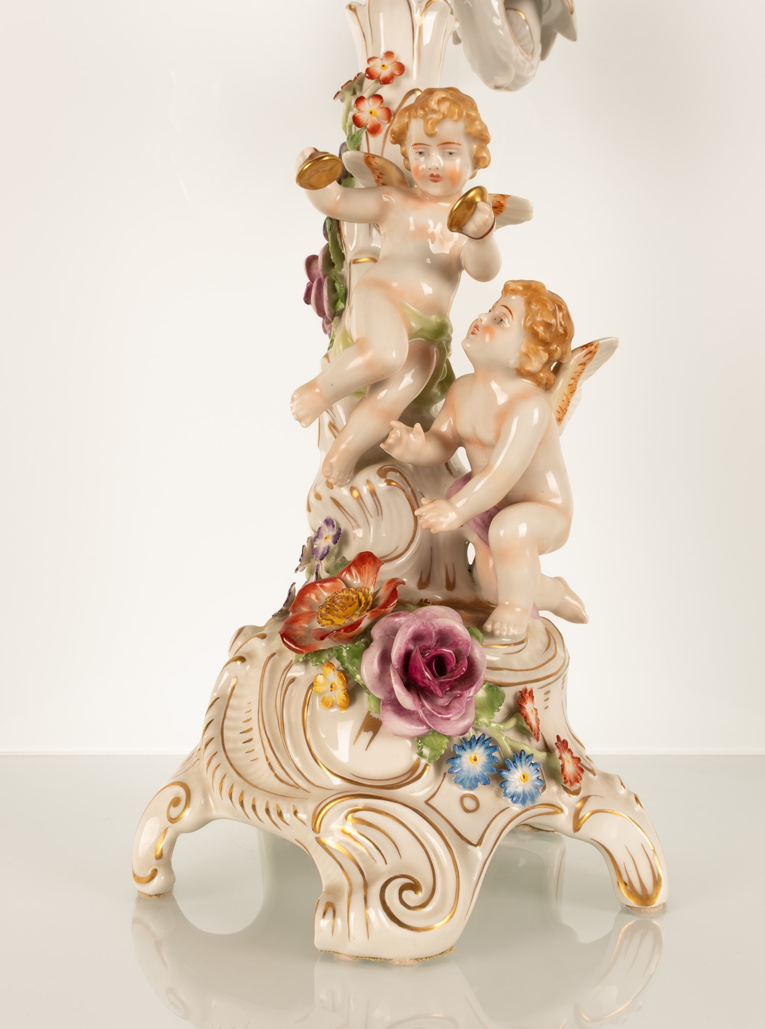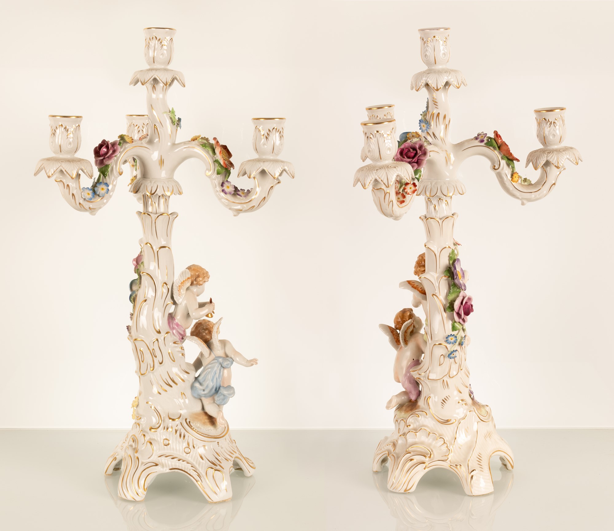 Coppia di grandi candelieri in porcellana con decoro plastico formato da putti e ghirlande di fiori a rilievo disposti sulla base e sugli elementi decorativi dei bracci (in stile rococò) Manifattura Sitzendorf, inizi del XX secolo.