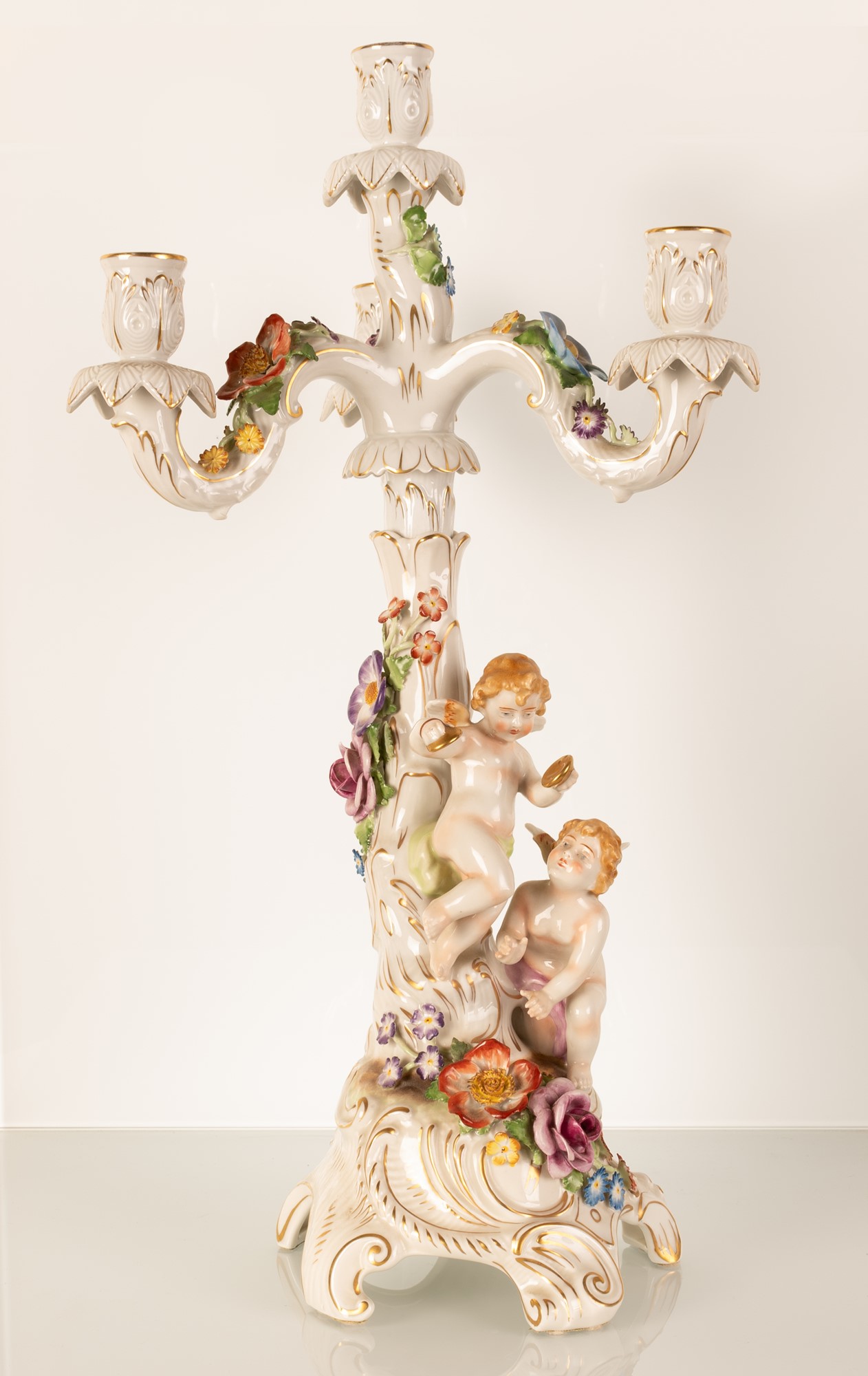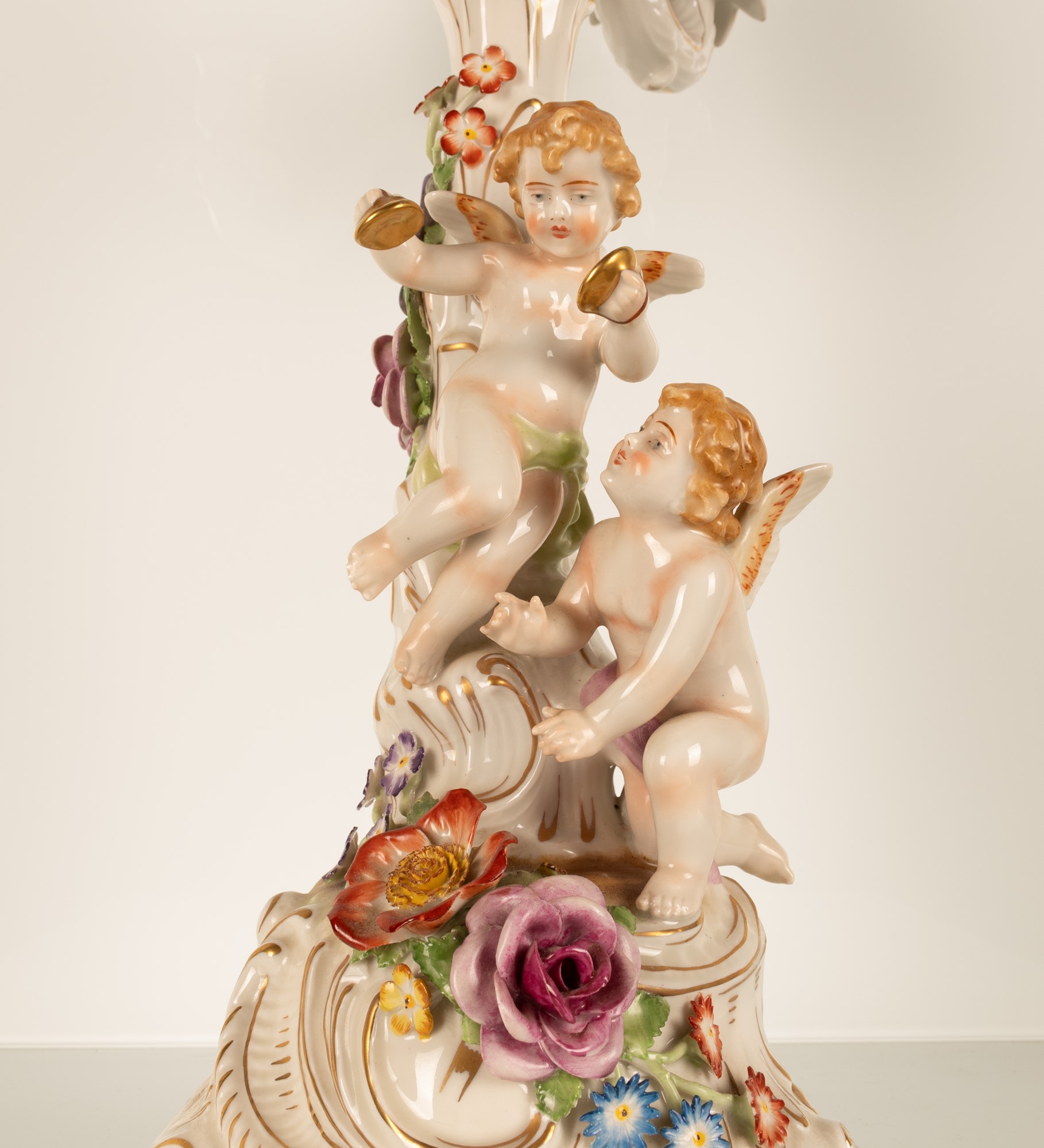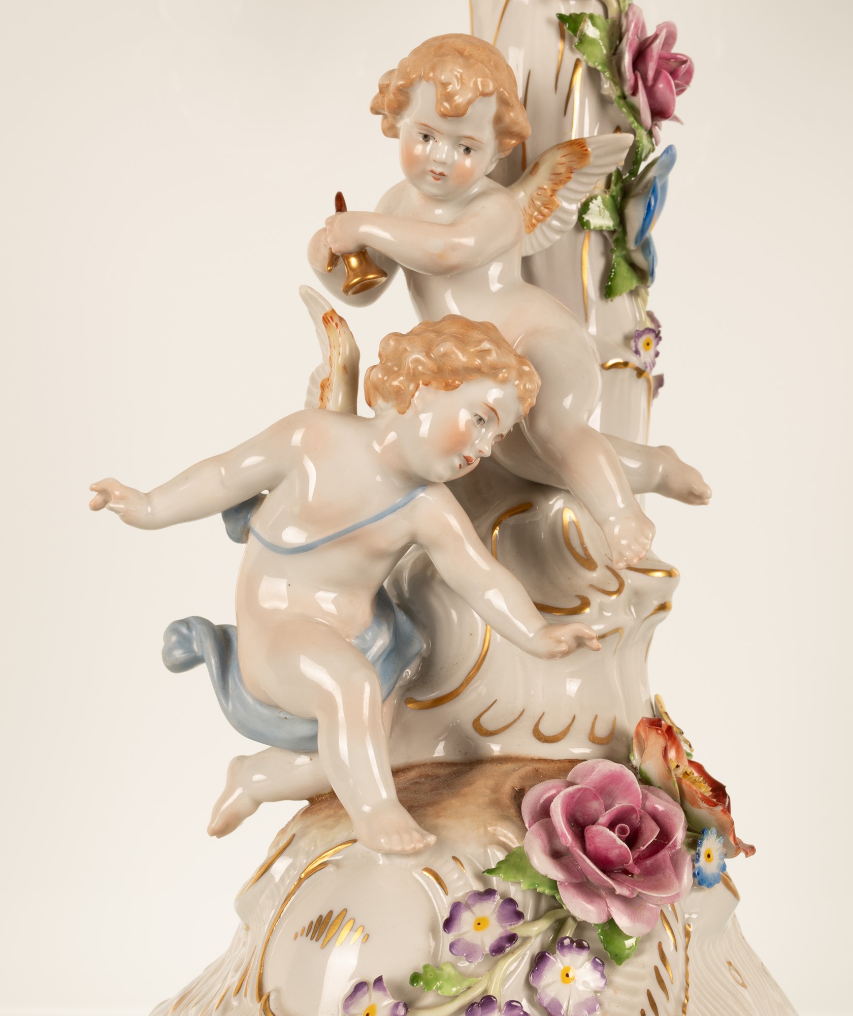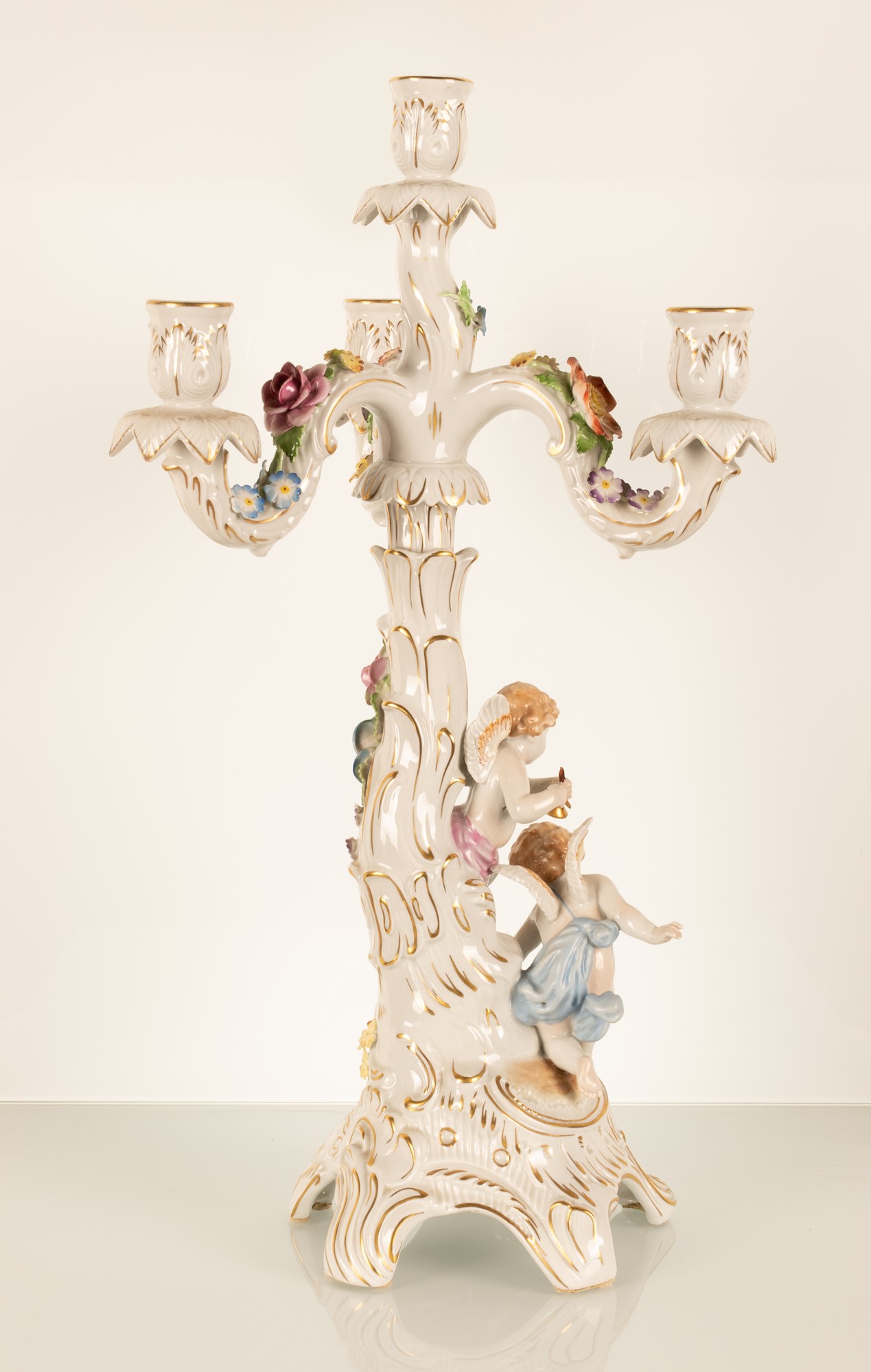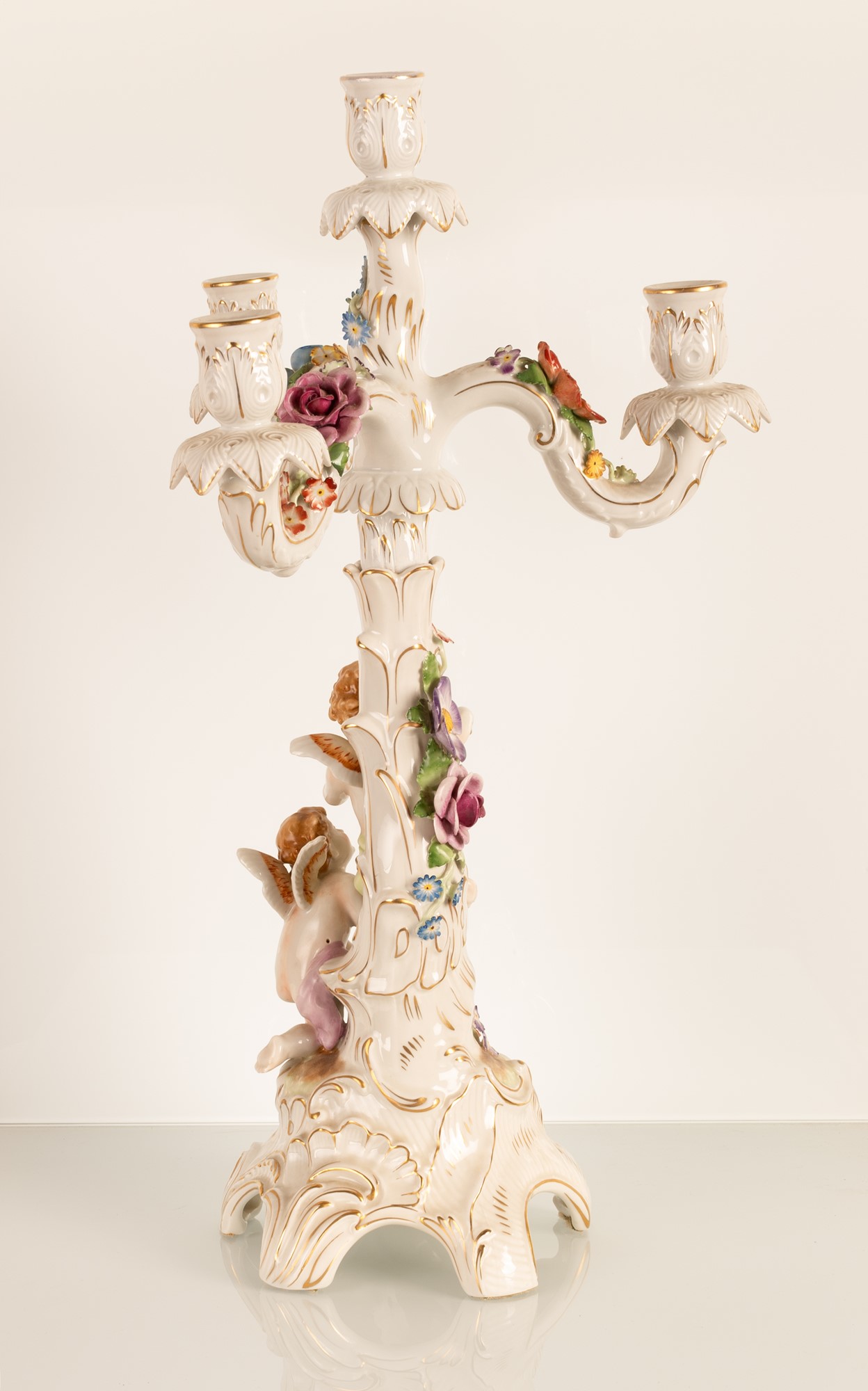 Coppia di grandi candelieri in porcellana con decoro plastico formato da putti e ghirlande di fiori a rilievo disposti sulla base e sugli elementi decorativi dei bracci (in stile rococò) Manifattura Sitzendorf, inizi del XX secolo.